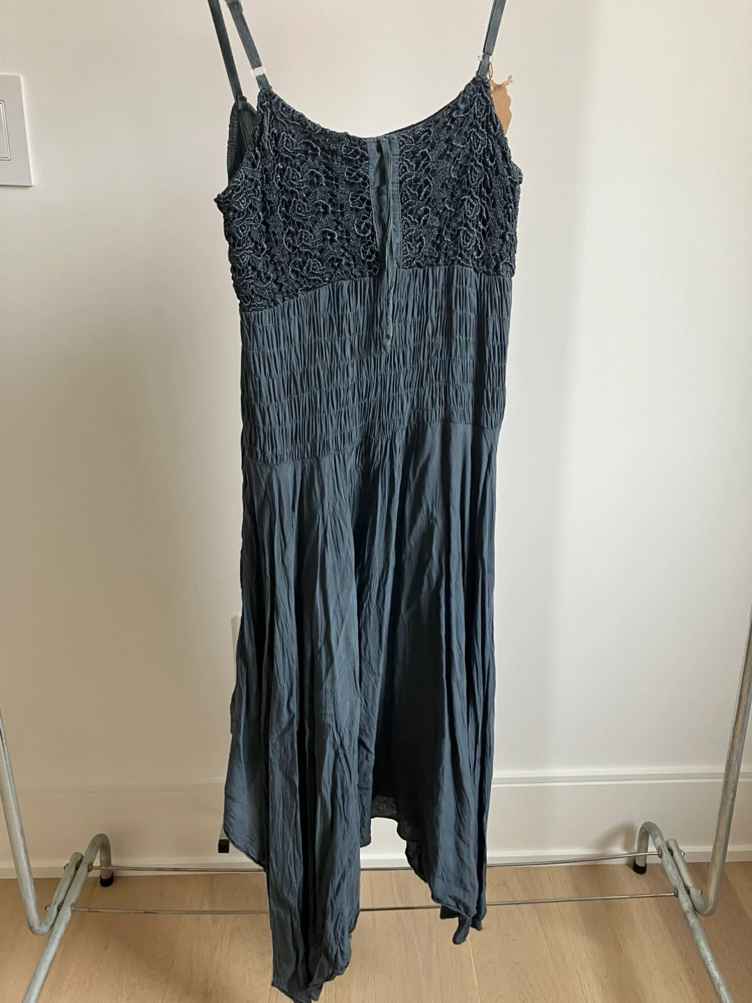 Cute grey dress with spaghetti straps in size small/medium. It features a unique design with a lace bodice and a flowy skirt.