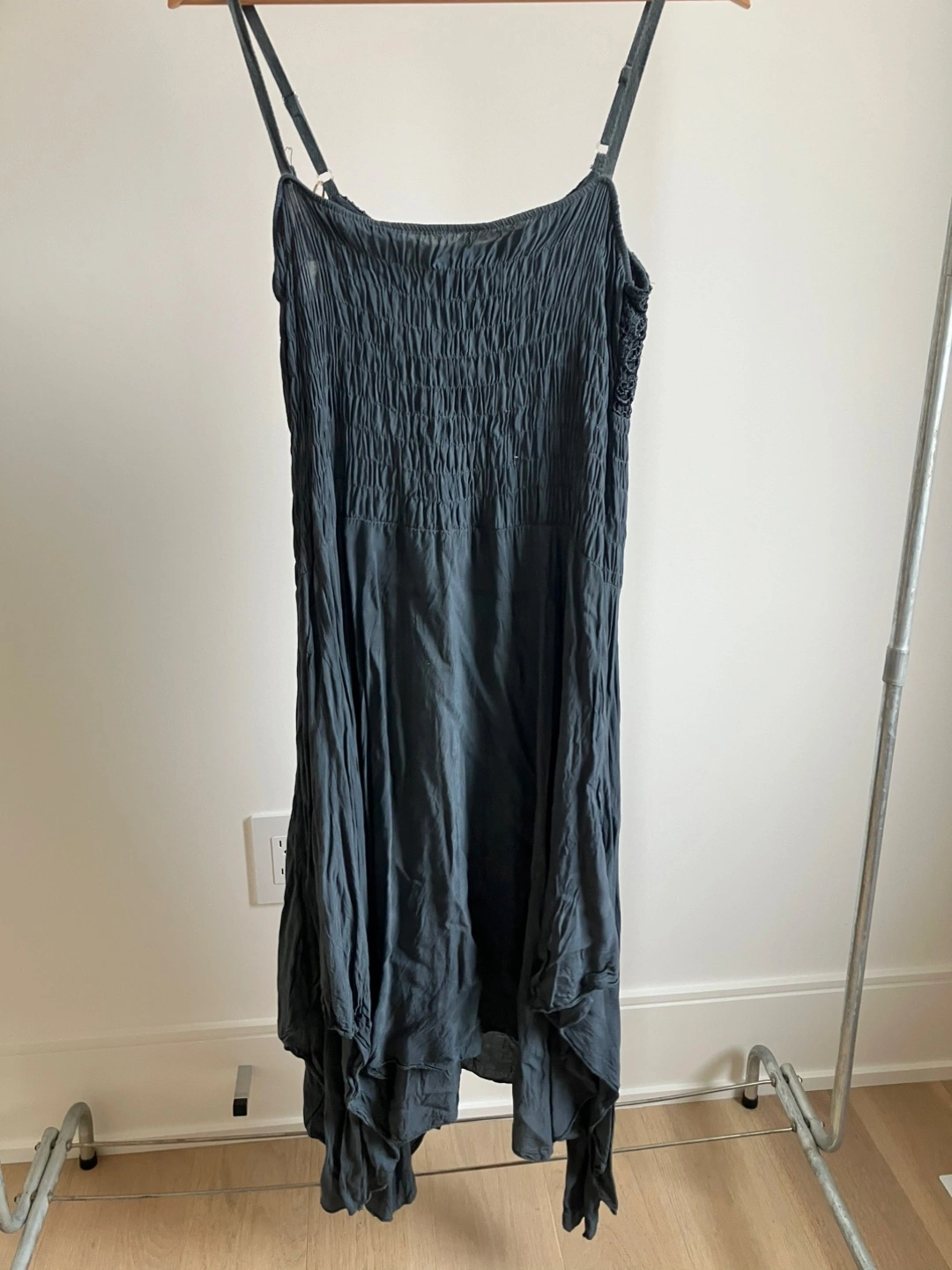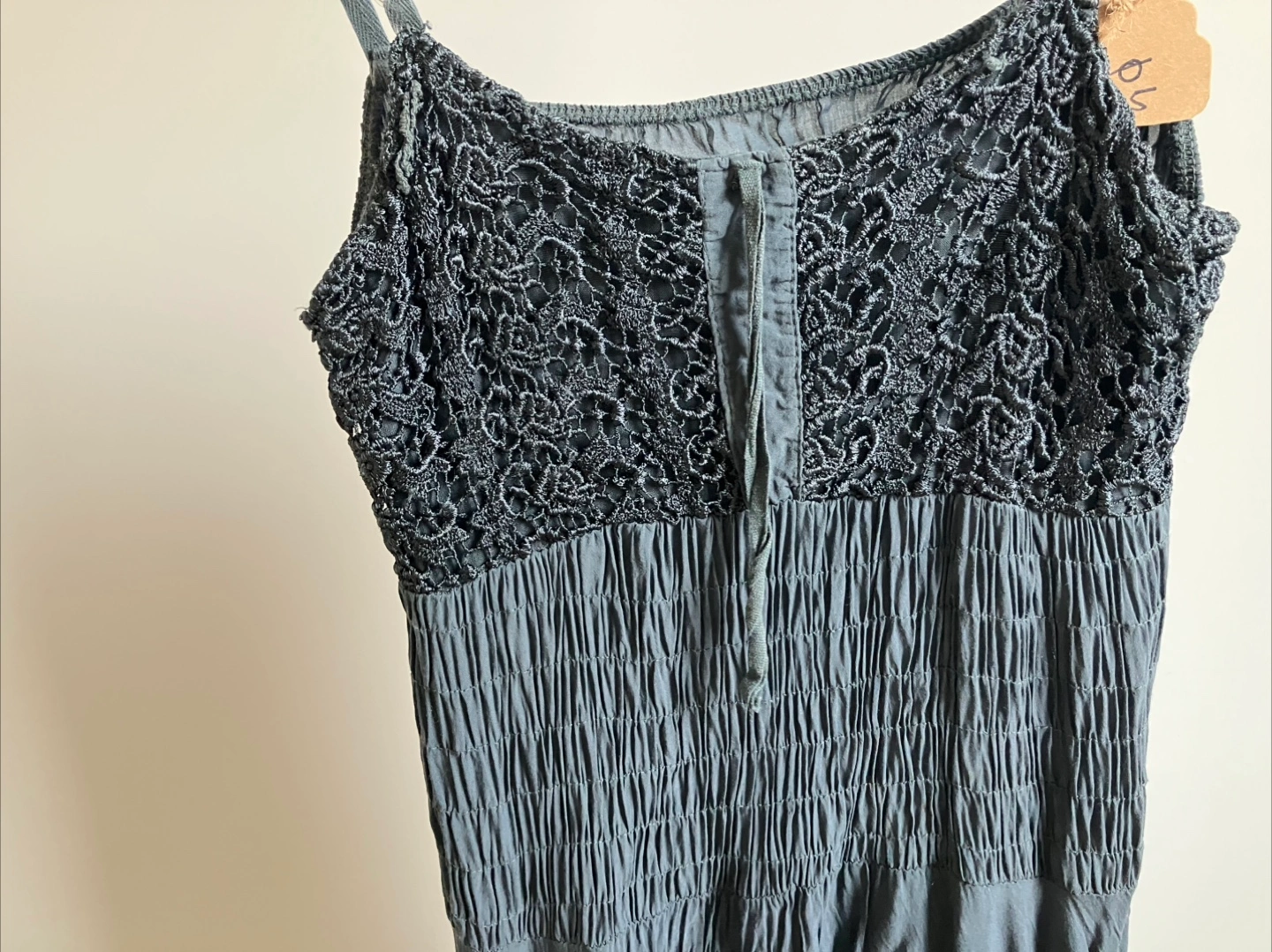 Cute grey dress with spaghetti straps in size small/medium. It features a unique design with a lace bodice and a flowy skirt.
