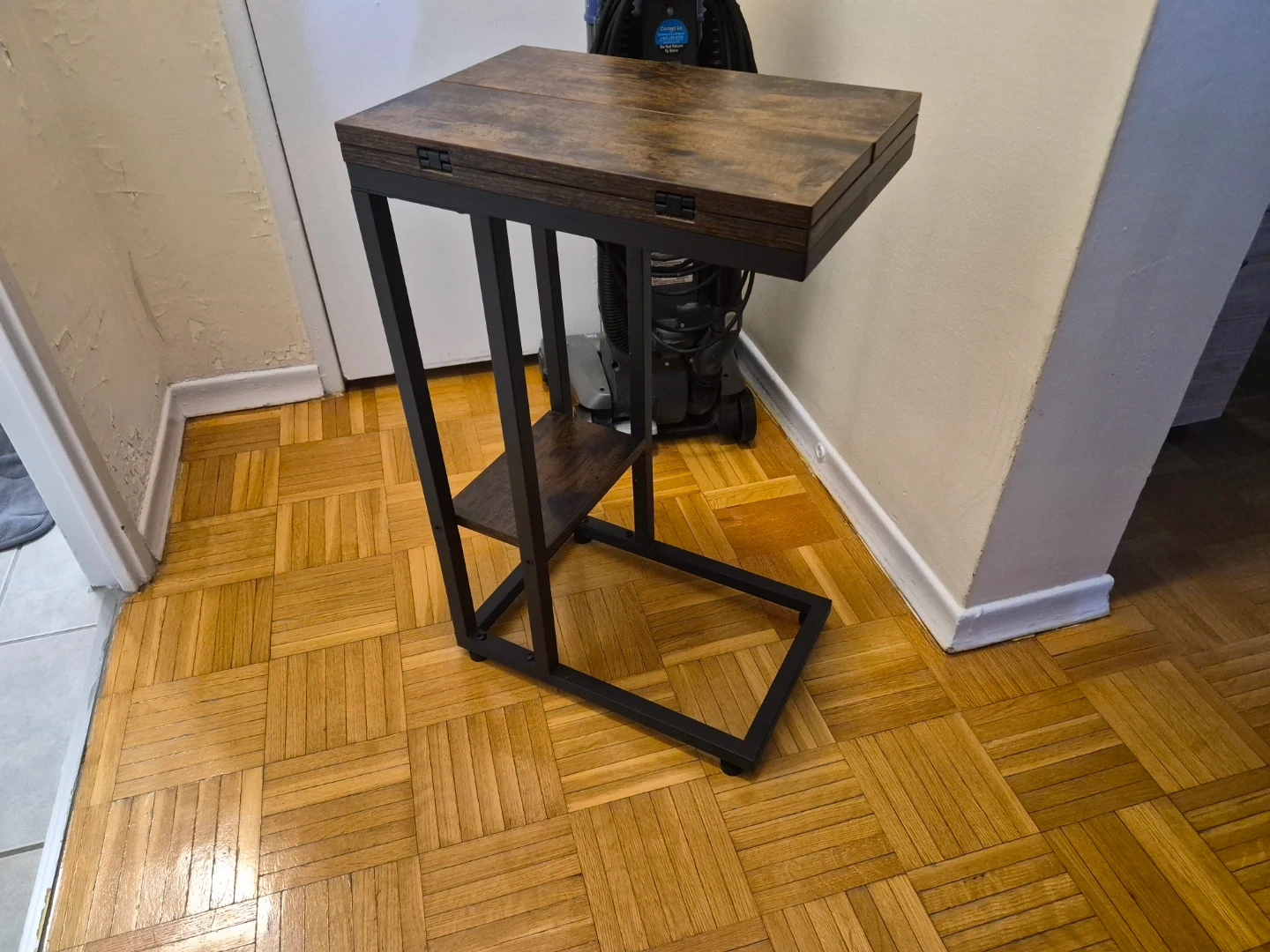 This handy c-table features a rustic wood-look top and a metal frame. It has a lower shelf for extra storage. It's great for placing your laptop or snacks next to the couch.