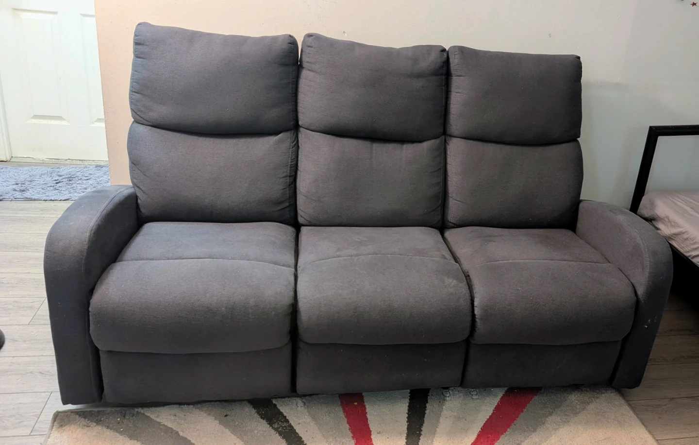 Dark grey three-seater reclining sofa. Upholstered in a soft, durable fabric. Each seat reclines independently. It's a comfortable seating option for a living room or entertainment space.