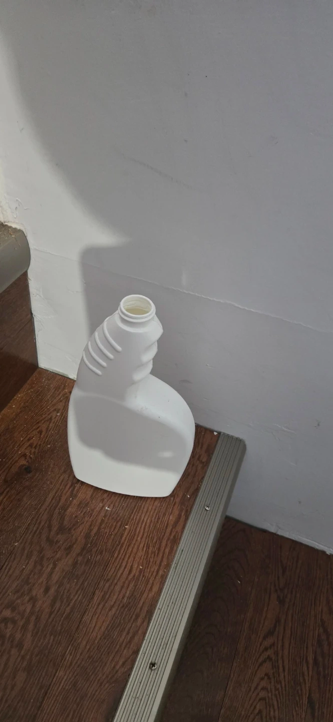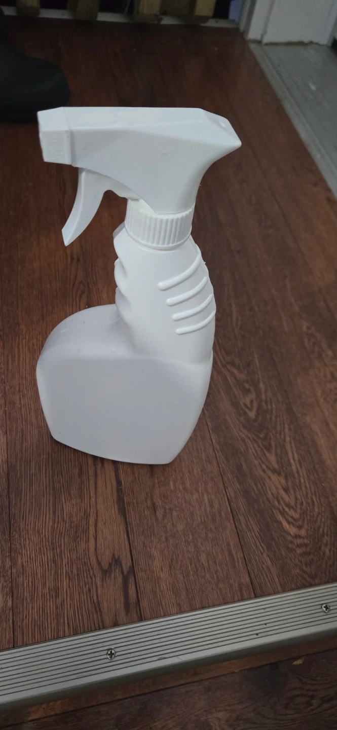 White plastic spray bottle with a white trigger sprayer. Includes a long dip tube. Bottle's capacity is approximately 500ml. This is great for cleaning solutions or DIY projects!