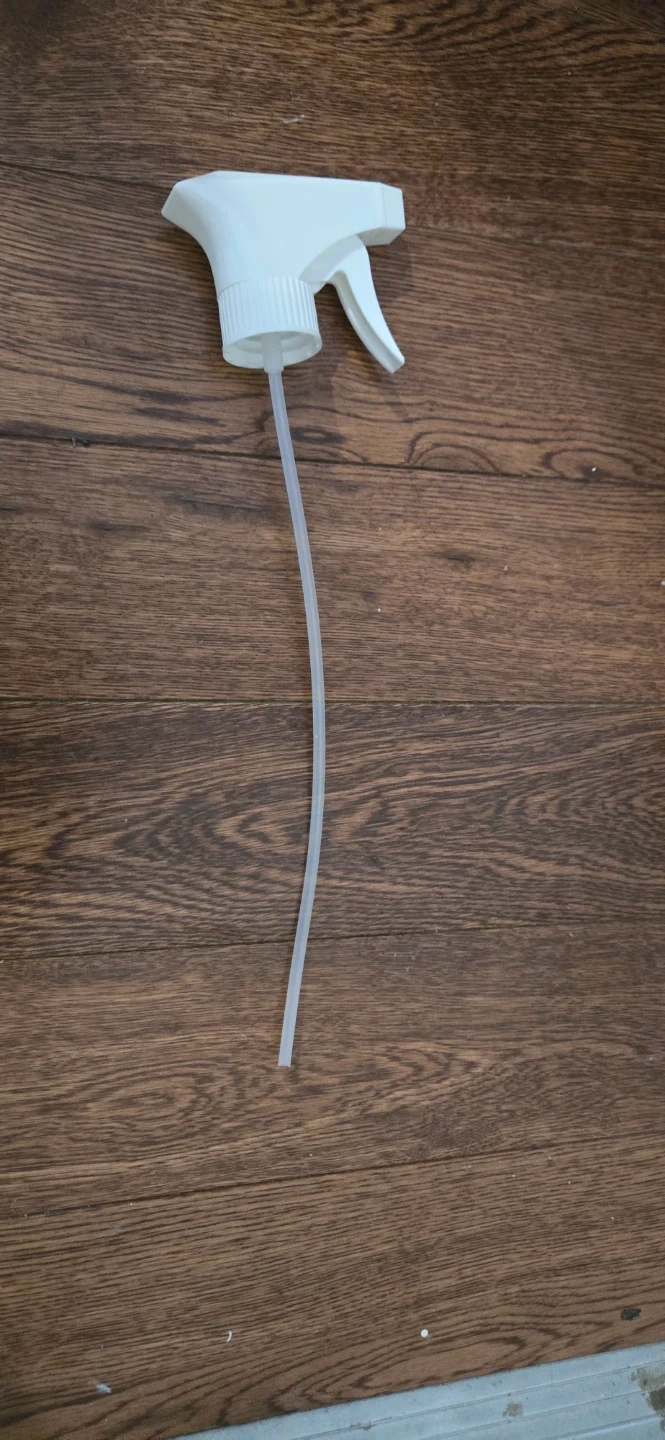 White plastic spray bottle with a white trigger sprayer. Includes a long dip tube. Bottle's capacity is approximately 500ml. This is great for cleaning solutions or DIY projects!