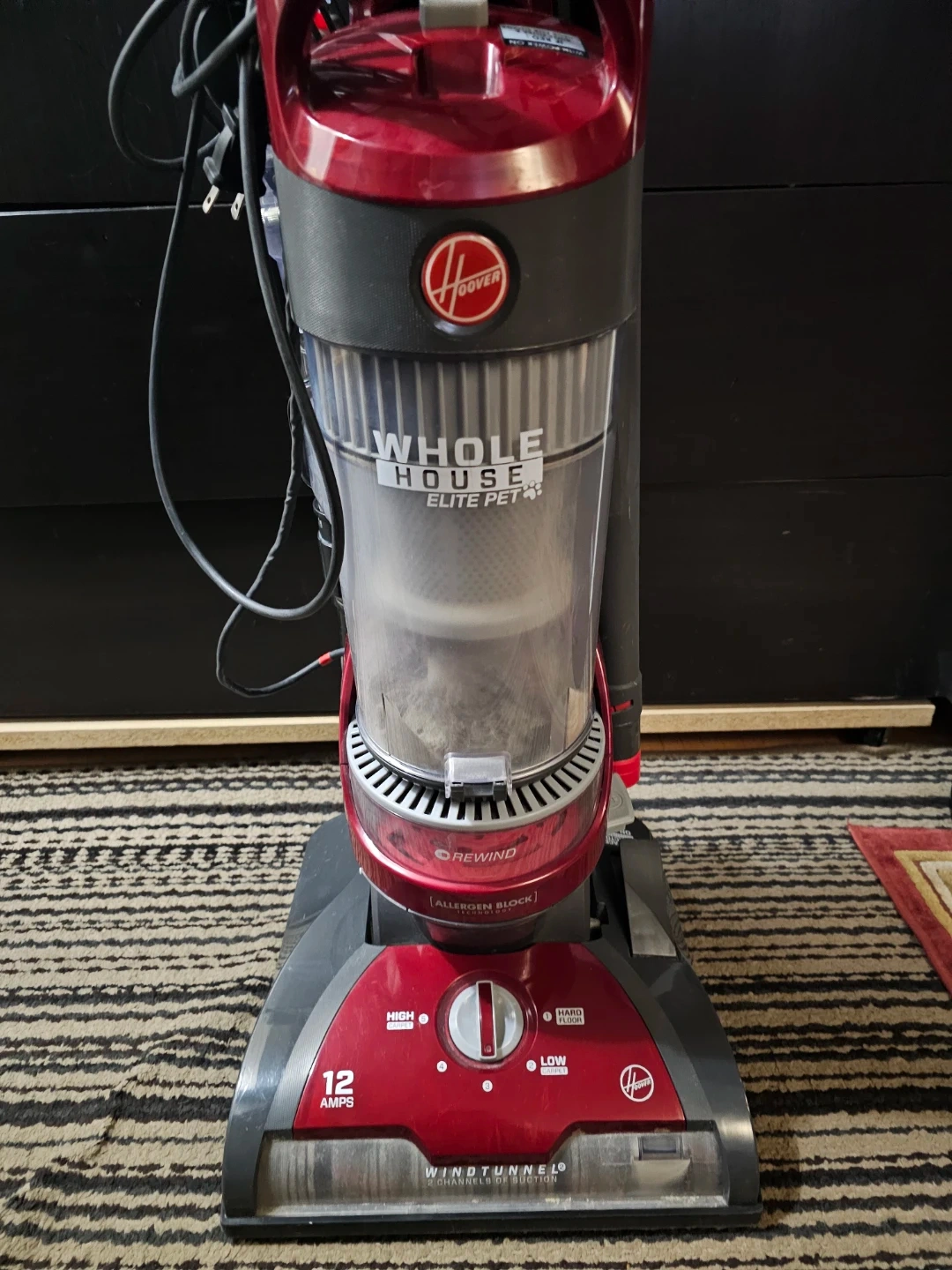This Hoover vacuum is designed for whole house cleaning and pet hair removal. It features WindTunnel Technology and a 12 AMP motor for powerful suction. Condition is used and it does squeak an fair bit but is fully functional otherwise and includes all components including manual.