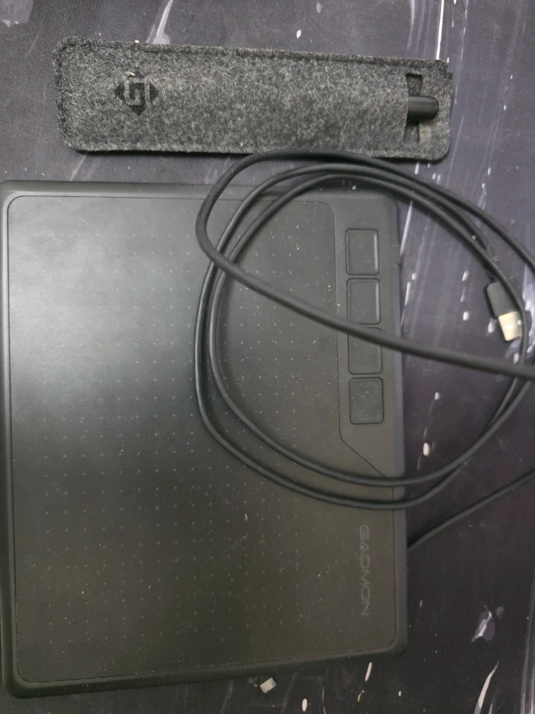 This is a GAOMON S620 battery-free graphic tablet with the original box. It's black and comes with a USB cable and a pen sleeve. It includes replacement pen nibs and a nib ring. This tablet is great for digital art, design work and OSU.