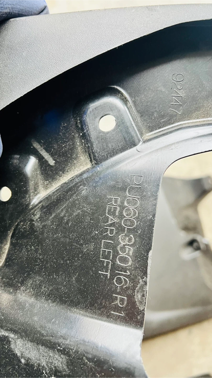 Set of four black mud flaps for rear left and right. Part number PU060-35016-R1 is visible on one of the flaps. These help protect your vehicle from mud and debris.