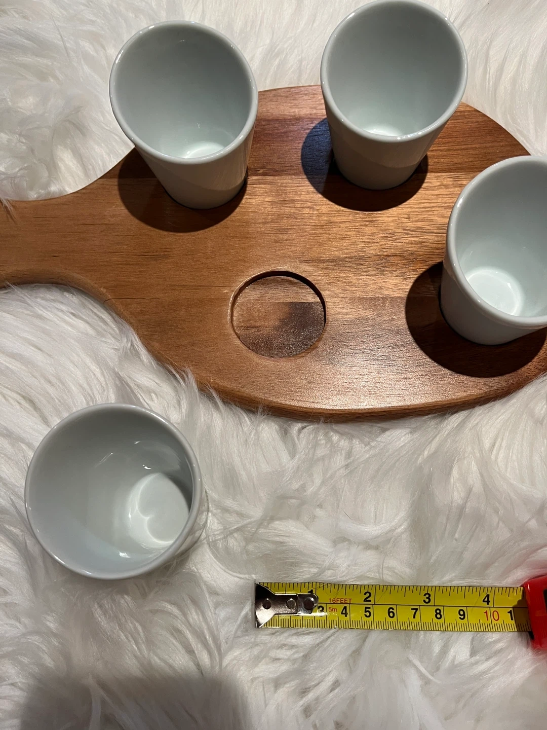 Selling a cute wooden serving board that comes with four ceramic cups! The cups are about 3 inches in diameter. Perfect for serving snacks or appetizers at your next gathering