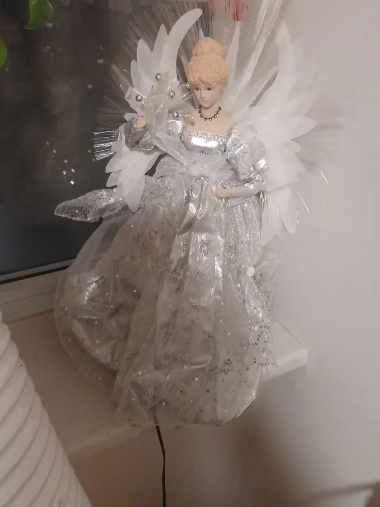Add a touch of elegance to your Christmas tree with this beautiful angel topper! The angel is dressed in a lovely silver gown with delicate wings. It's the perfect finishing touch for your holiday decor