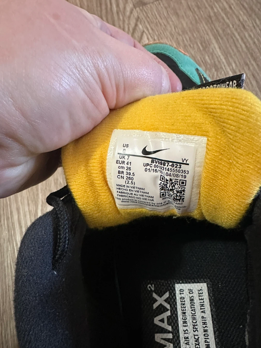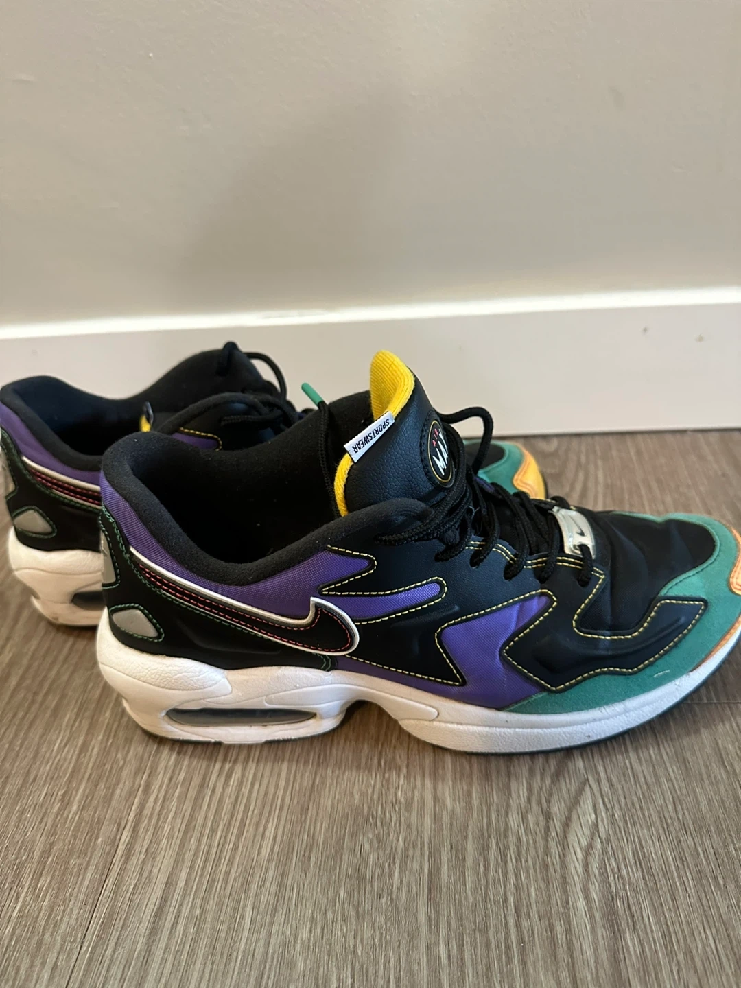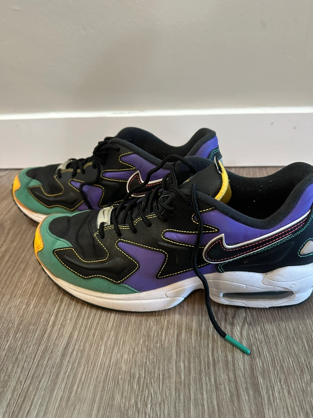 Selling a pair of Nike Air Max 2 Light sneakers! They feature a unique colourway with black, purple, green, and yellow accents. These shoes are in good condition and ready for a new home!