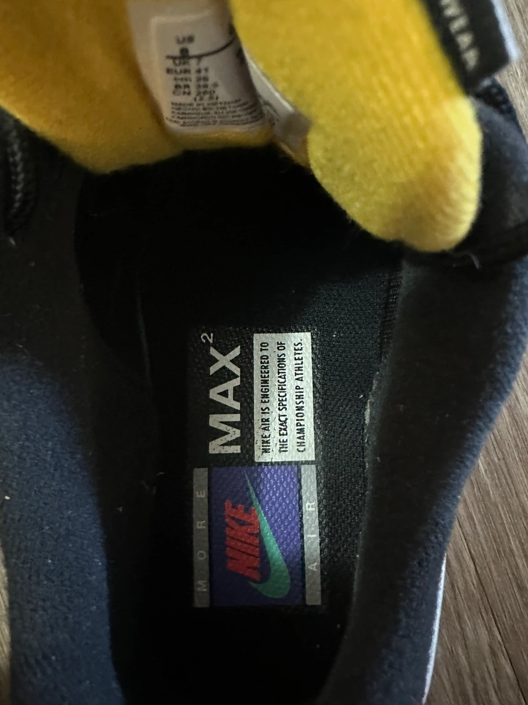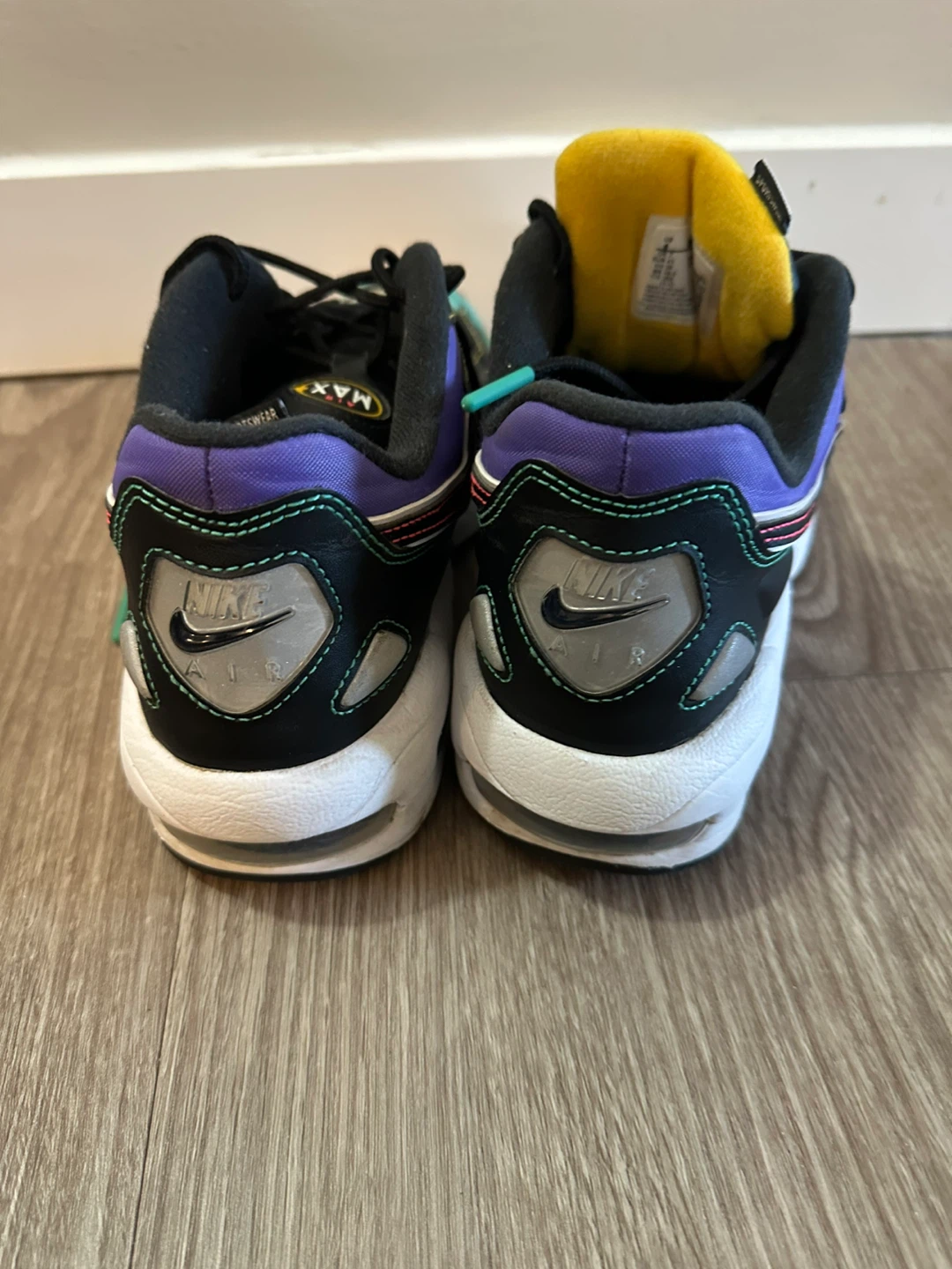 Selling a pair of Nike Air Max 2 Light sneakers! They feature a unique colourway with black, purple, green, and yellow accents. These shoes are in good condition and ready for a new home!