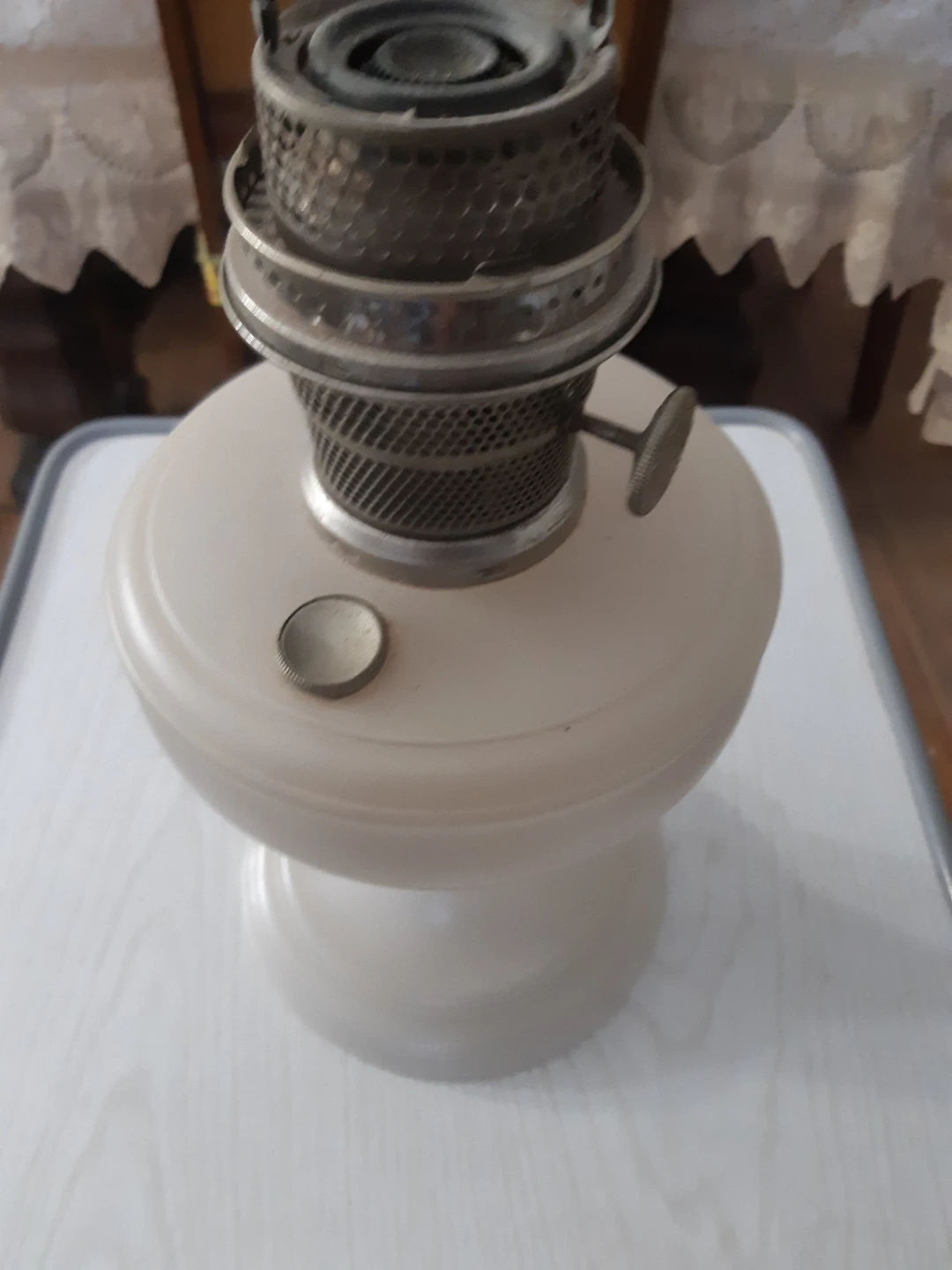 This is a vintage kerosene lamp with a beige glass base and a metal burner assembly. It has a ribbed texture on the metal parts and a functional adjustment knob. The base is smooth and bulbous, providing a stable foundation. It's a classic piece for ambient lighting or decor.