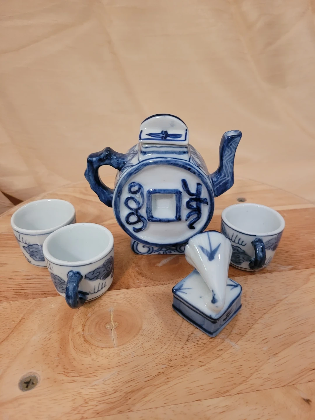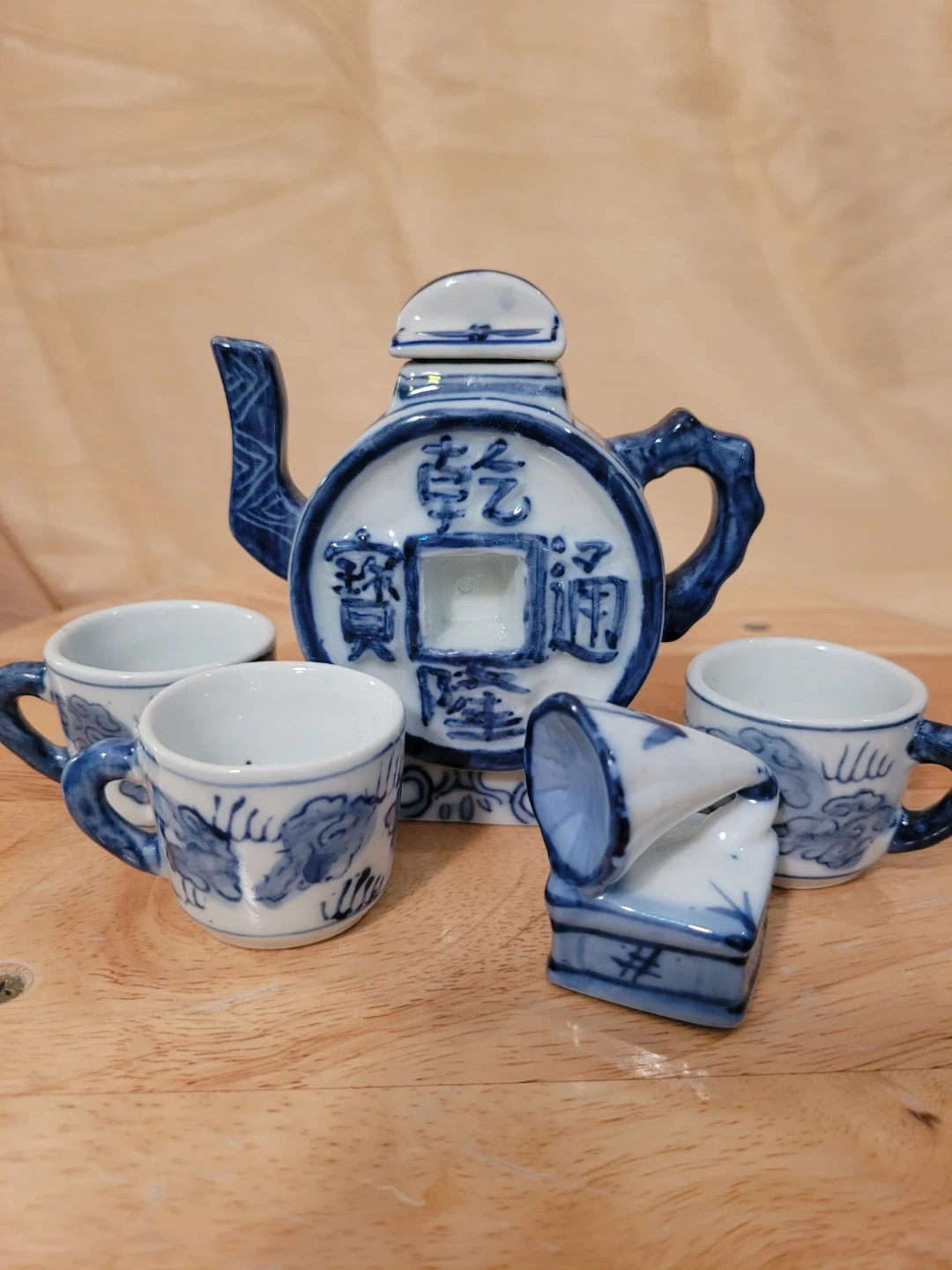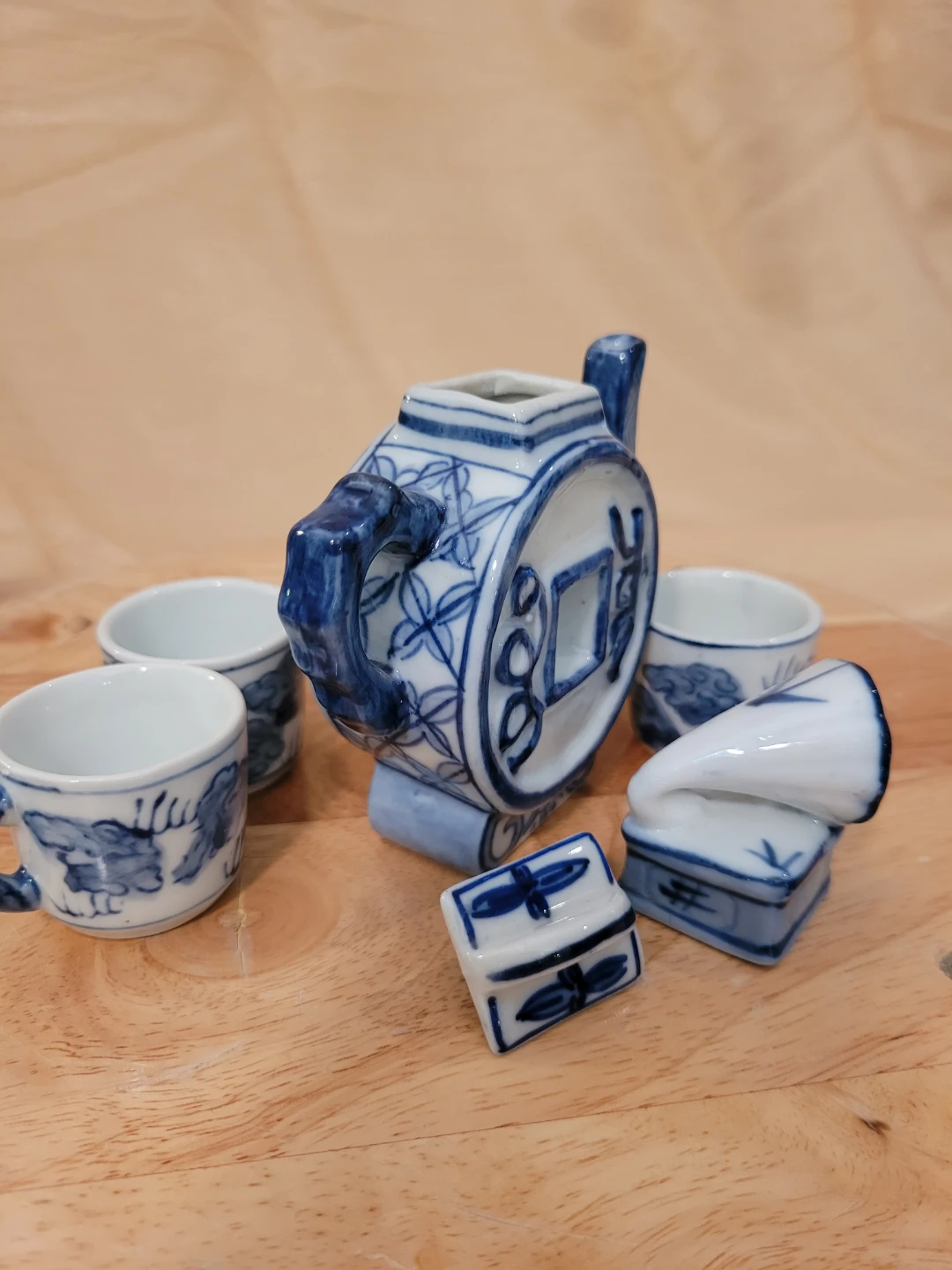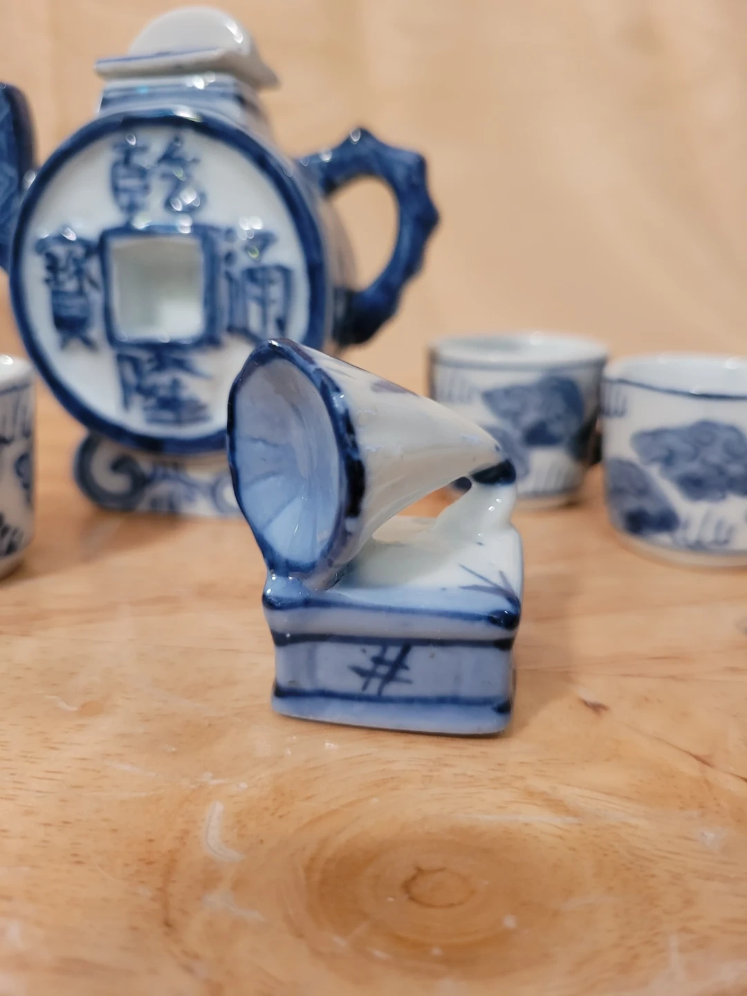 This is a miniature teapot set featuring a blue and white design. It includes a teapot, three cups, and a decorative gramophone. The pieces are made of ceramic with a traditional oriental motif. Good condition with minor or wear. See photos for condition.