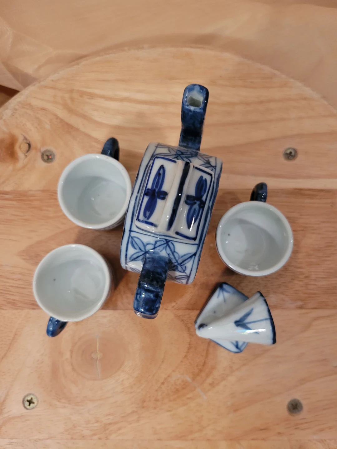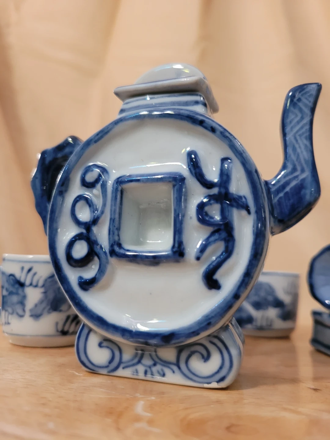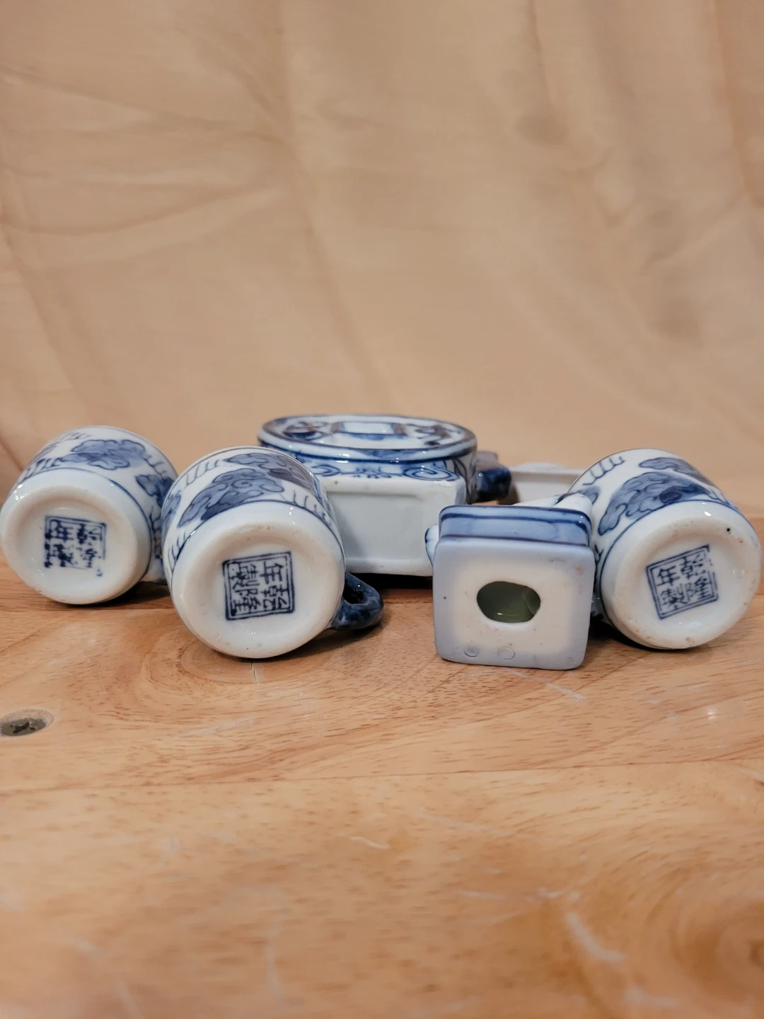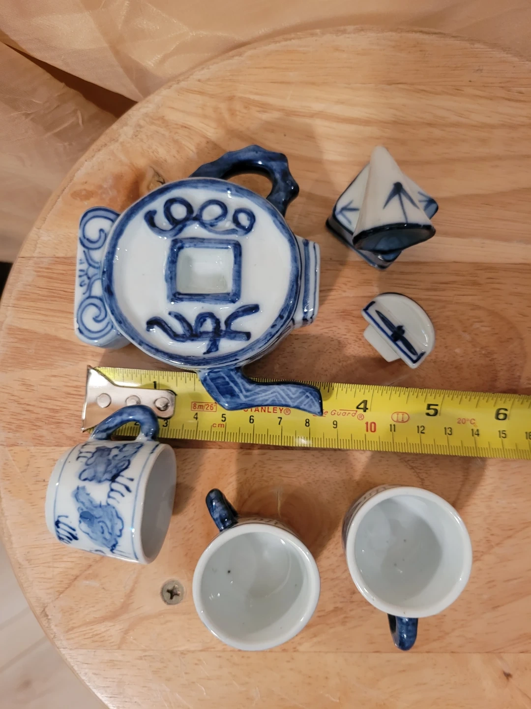 This is a miniature teapot set featuring a blue and white design. It includes a teapot, three cups, and a decorative gramophone. The pieces are made of ceramic with a traditional oriental motif. Good condition with minor or wear. See photos for condition.