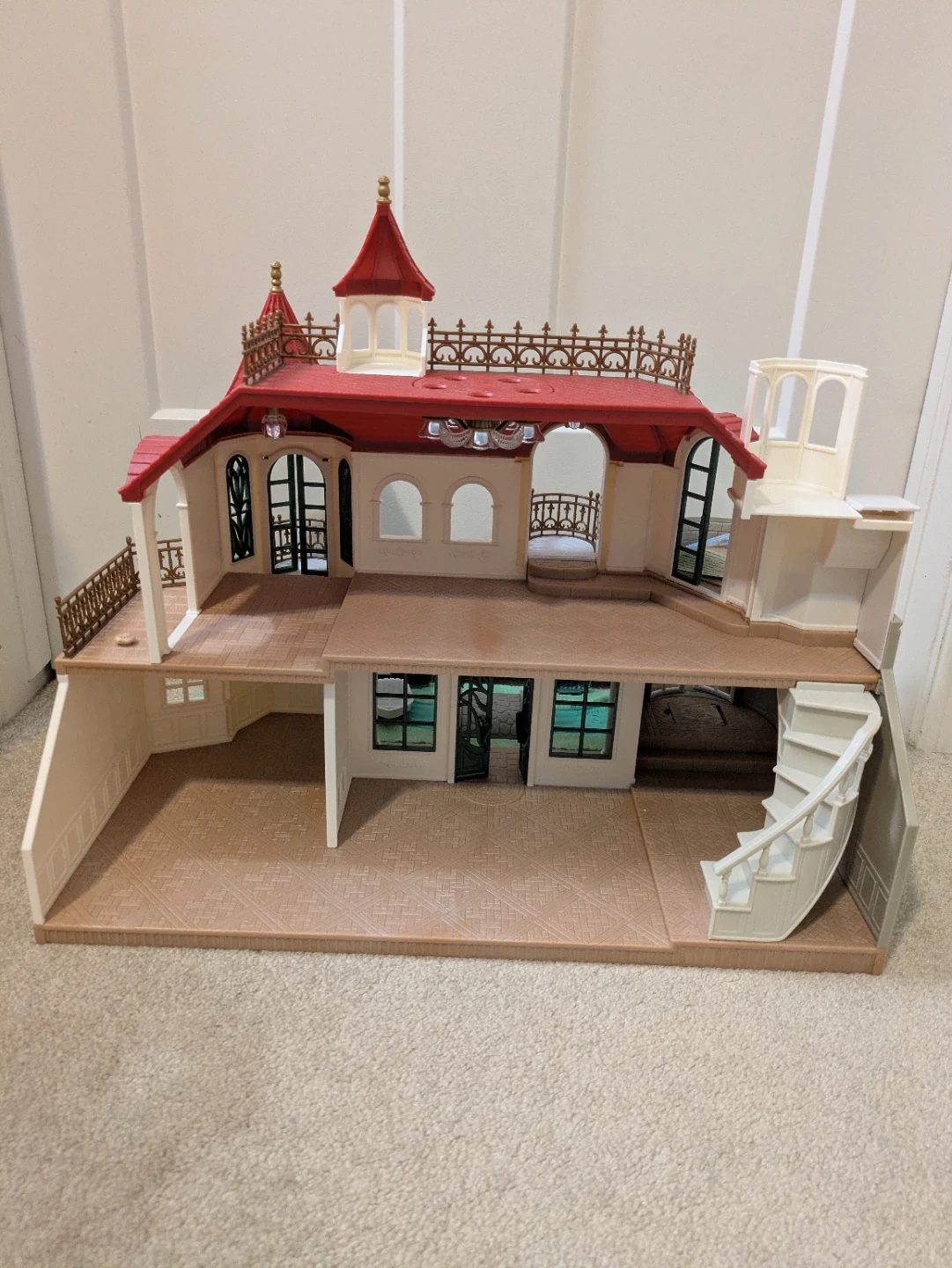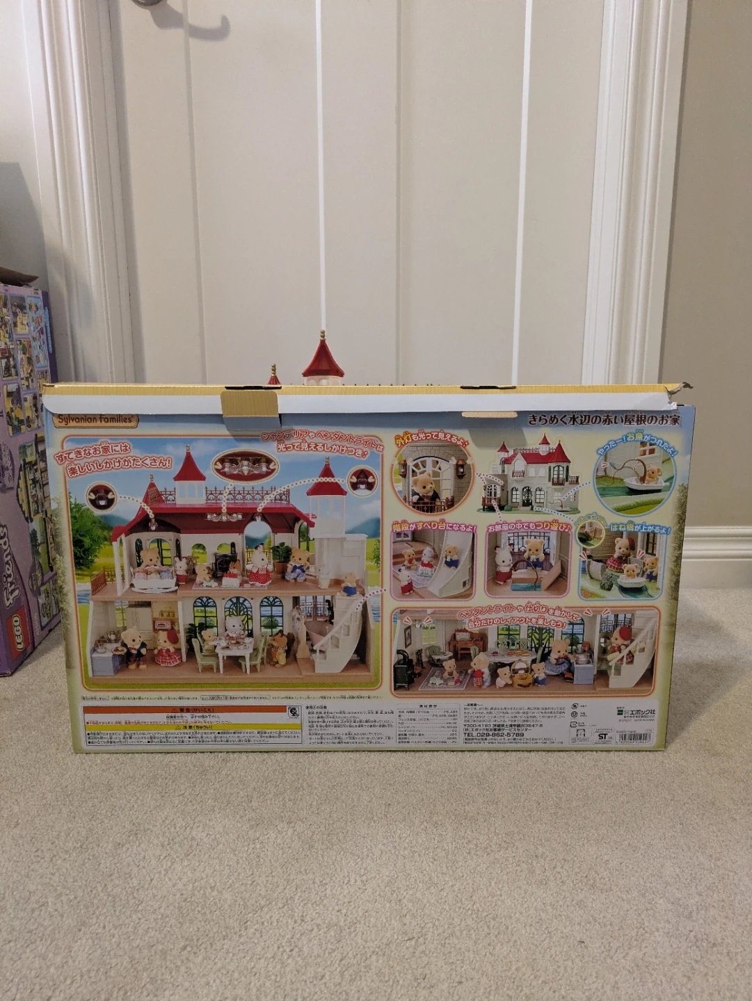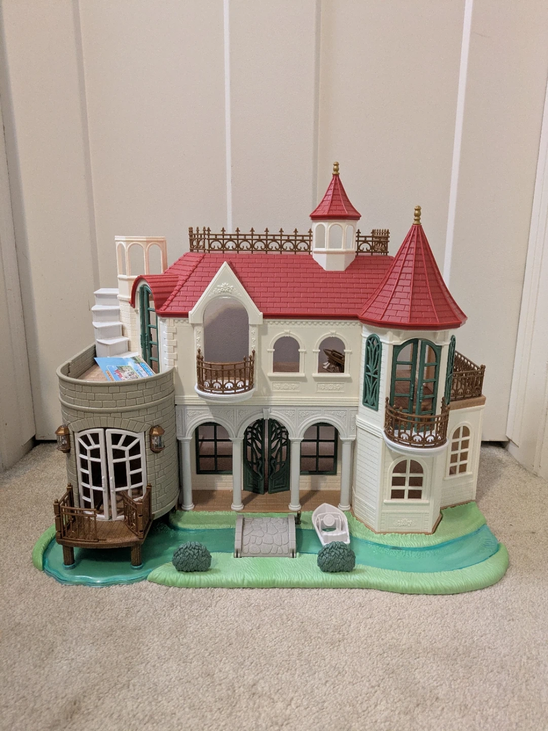 It's a calico critters house. Features multiple floors, balconies, and a charming red roof design. Includes a small boat and bridge accessory.