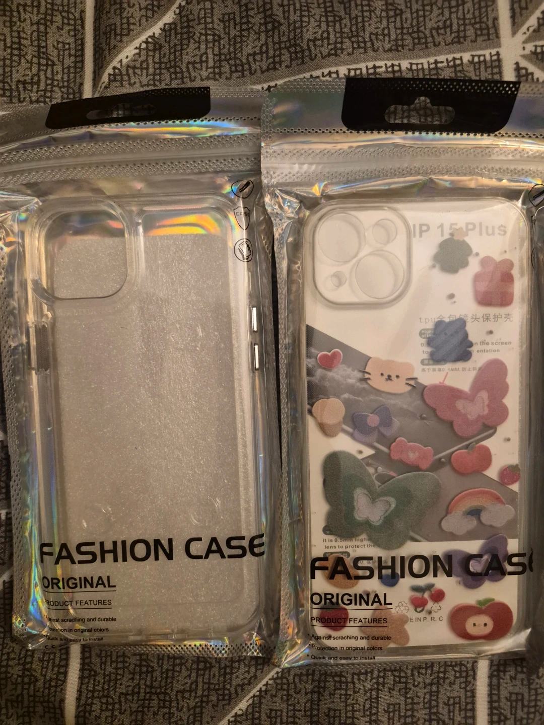 Selling two new Fashion Cases! One is clear and the other has cute stickers. Both are original and designed for the iPhone 15 Plus. They offer protection against scratching and are easy to install