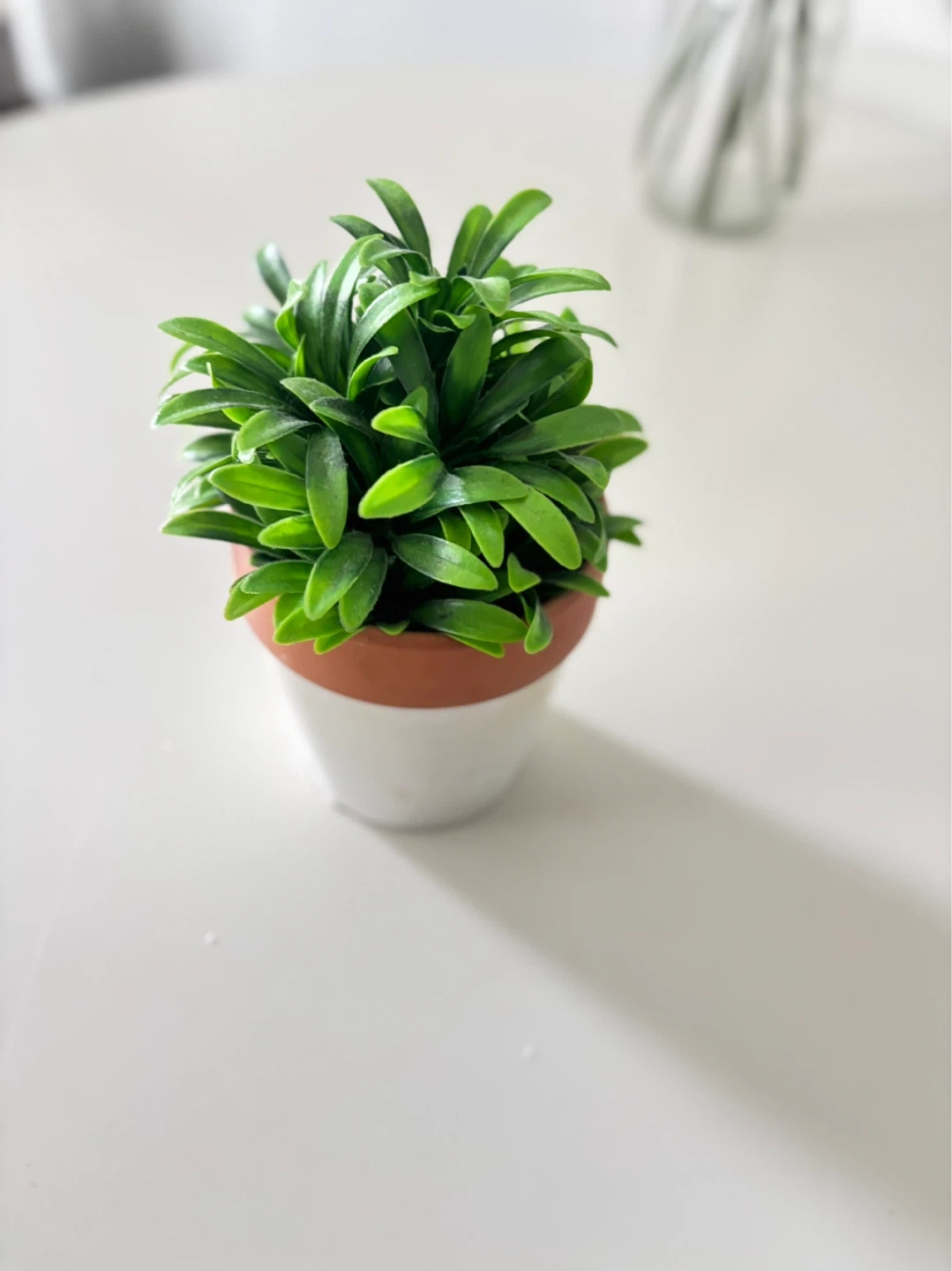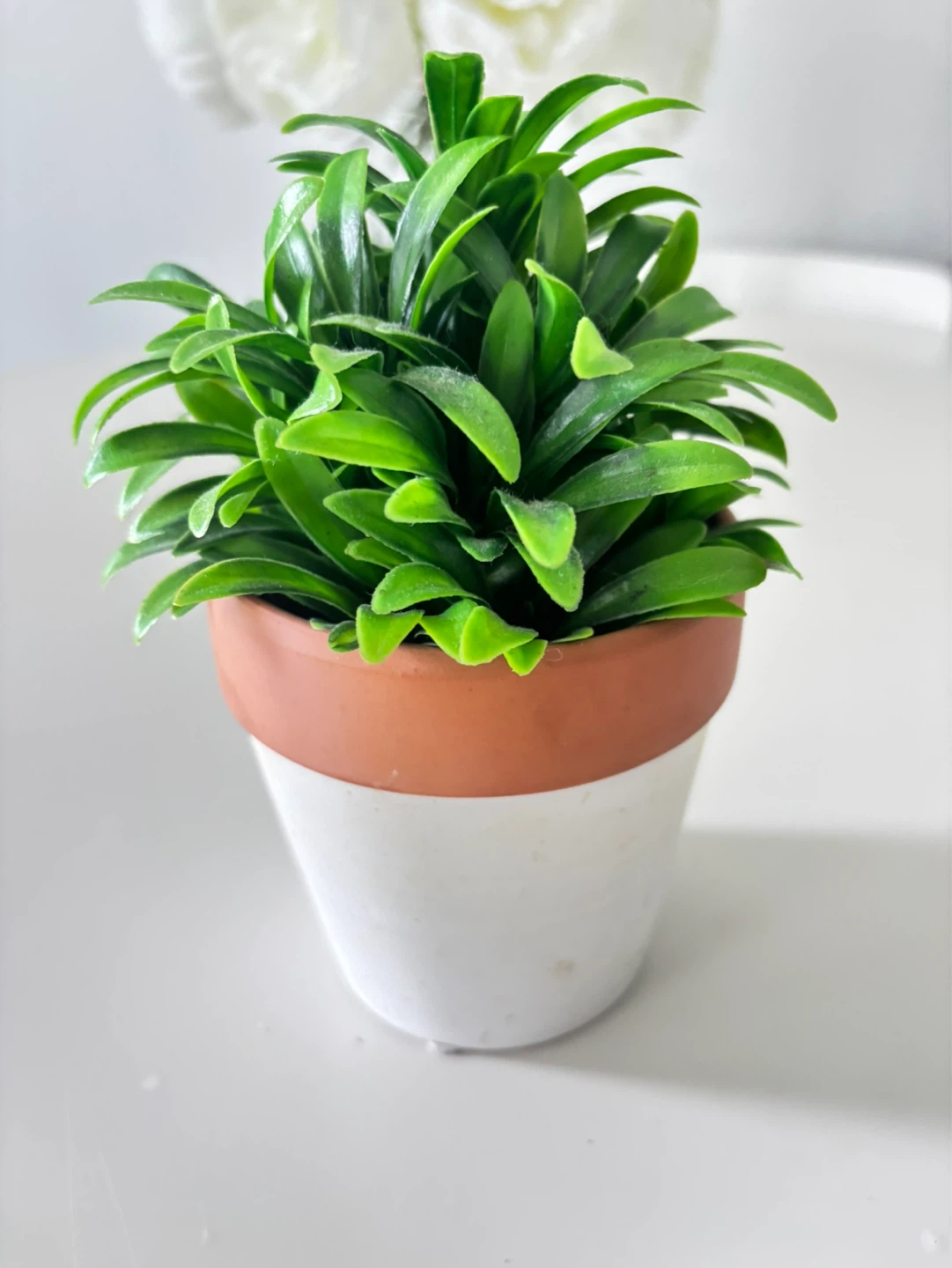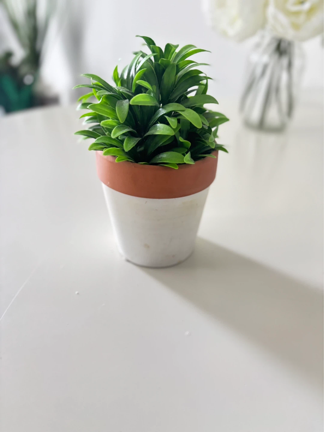 This is a small artificial plant in a decorative pot. The pot has a white base with a terracotta-coloured rim. It's a nice accent for any room. The plant doesn't require any watering!