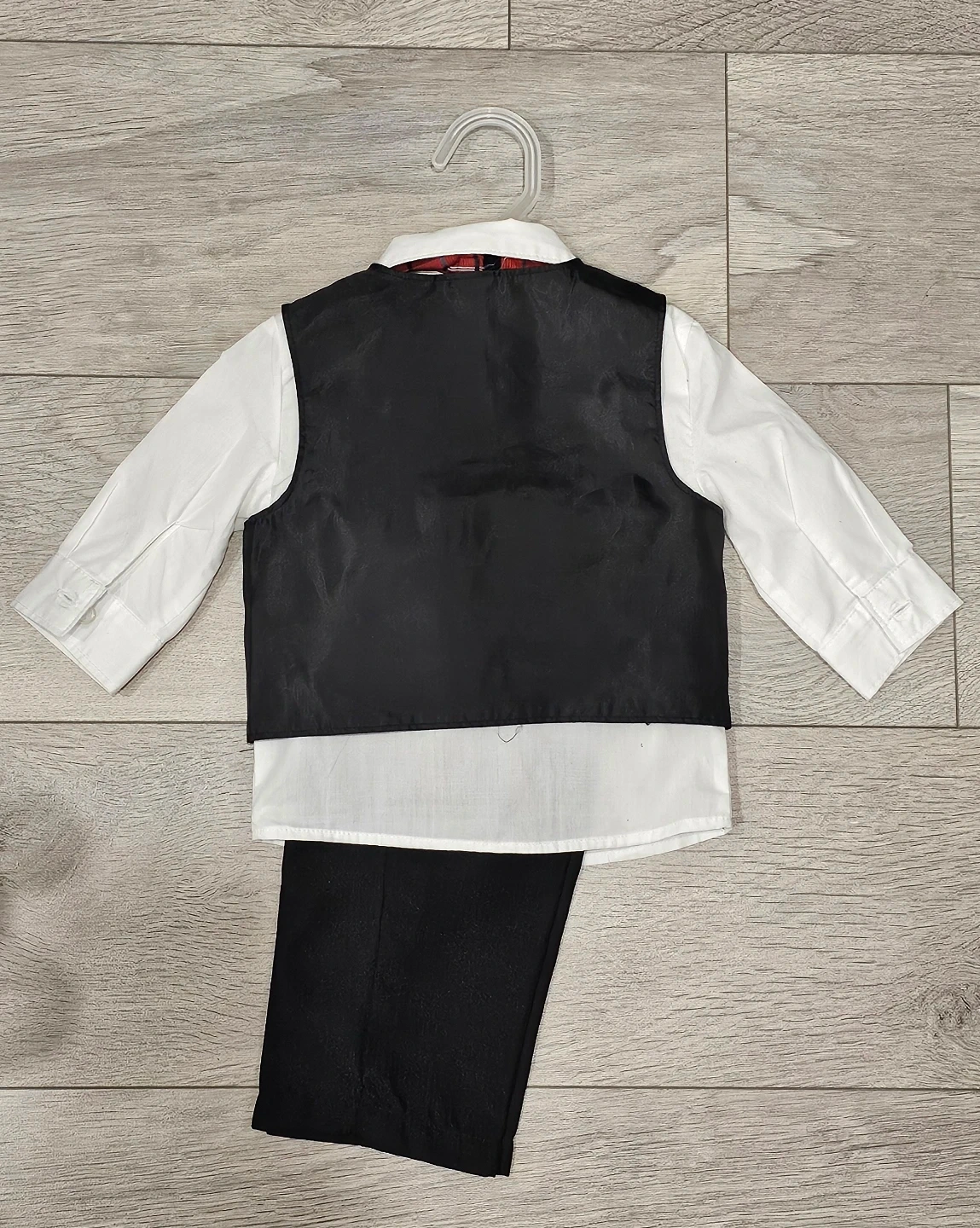 Little gentleman's formal wear set! It's a three-piece outfit including a white button-up shirt, a pinstripe vest, and black pants. The vest has a cute red and white patterned pocket square accent. It's perfect for special occasions!