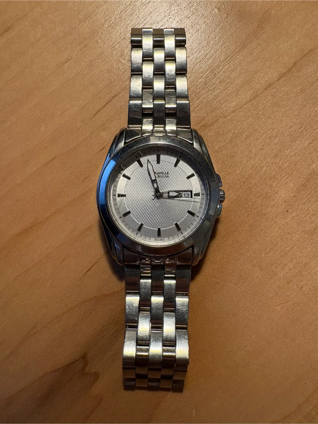 Selling a Bulova Caravelle men's watch! It features a silver-tone stainless steel band and a classic design. The watch is water-resistant and has a date display. It's in great condition and ready for a new wrist! Battery changed recently