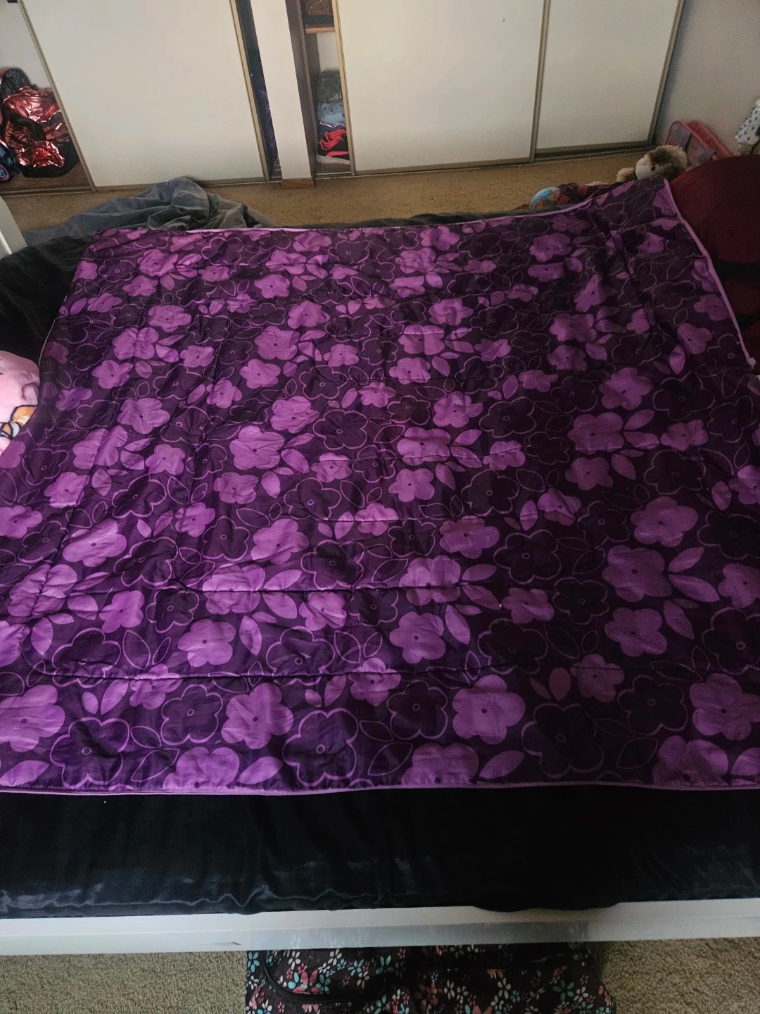A cozy quilt featuring a lovely purple floral pattern. It's soft and would add a nice touch to any bedroom. Machine washable for easy care.