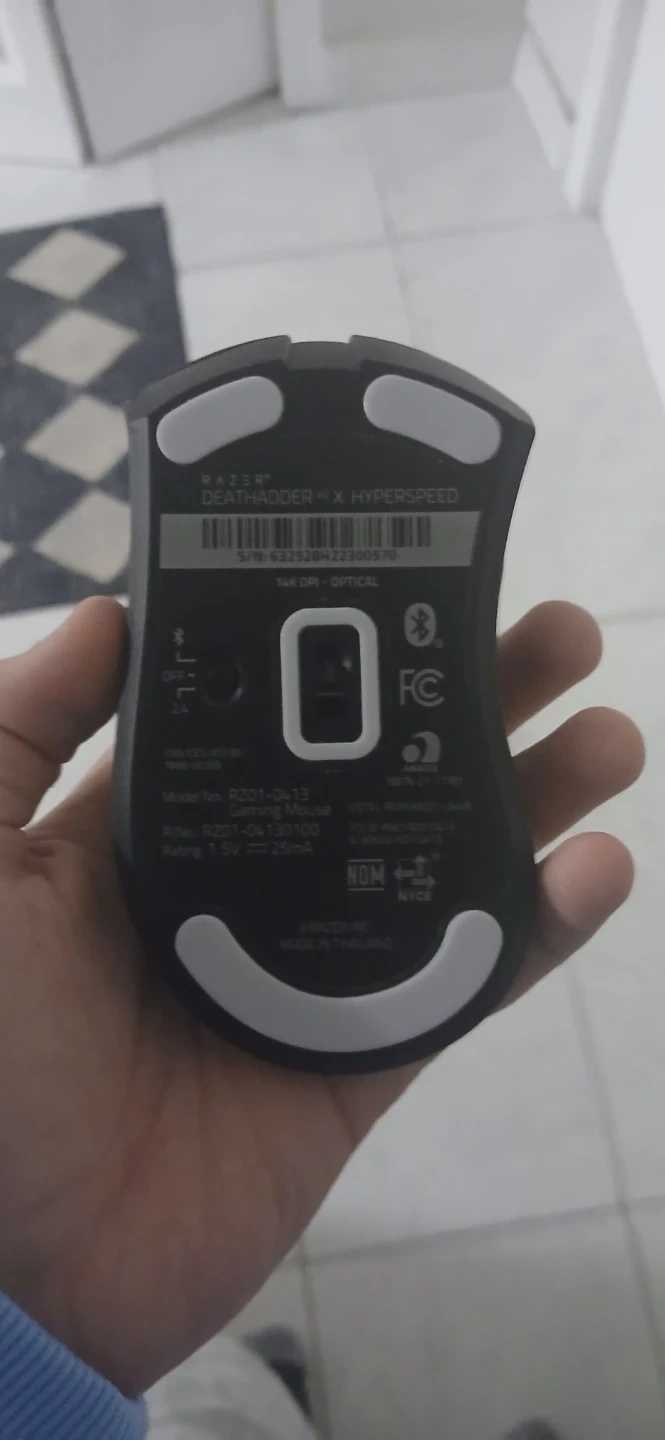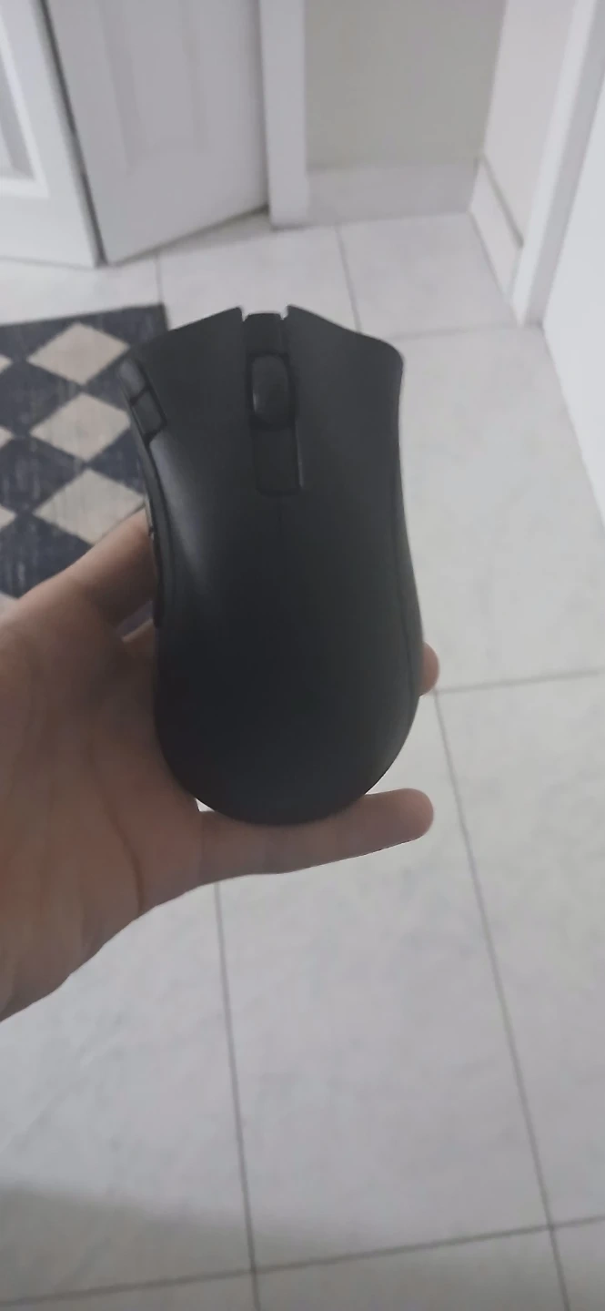 This is a Razer DeathAdder V2 X Hyperspeed wireless mouse. It's black and uses optical tracking. It's powered by a single AA or AAA battery.