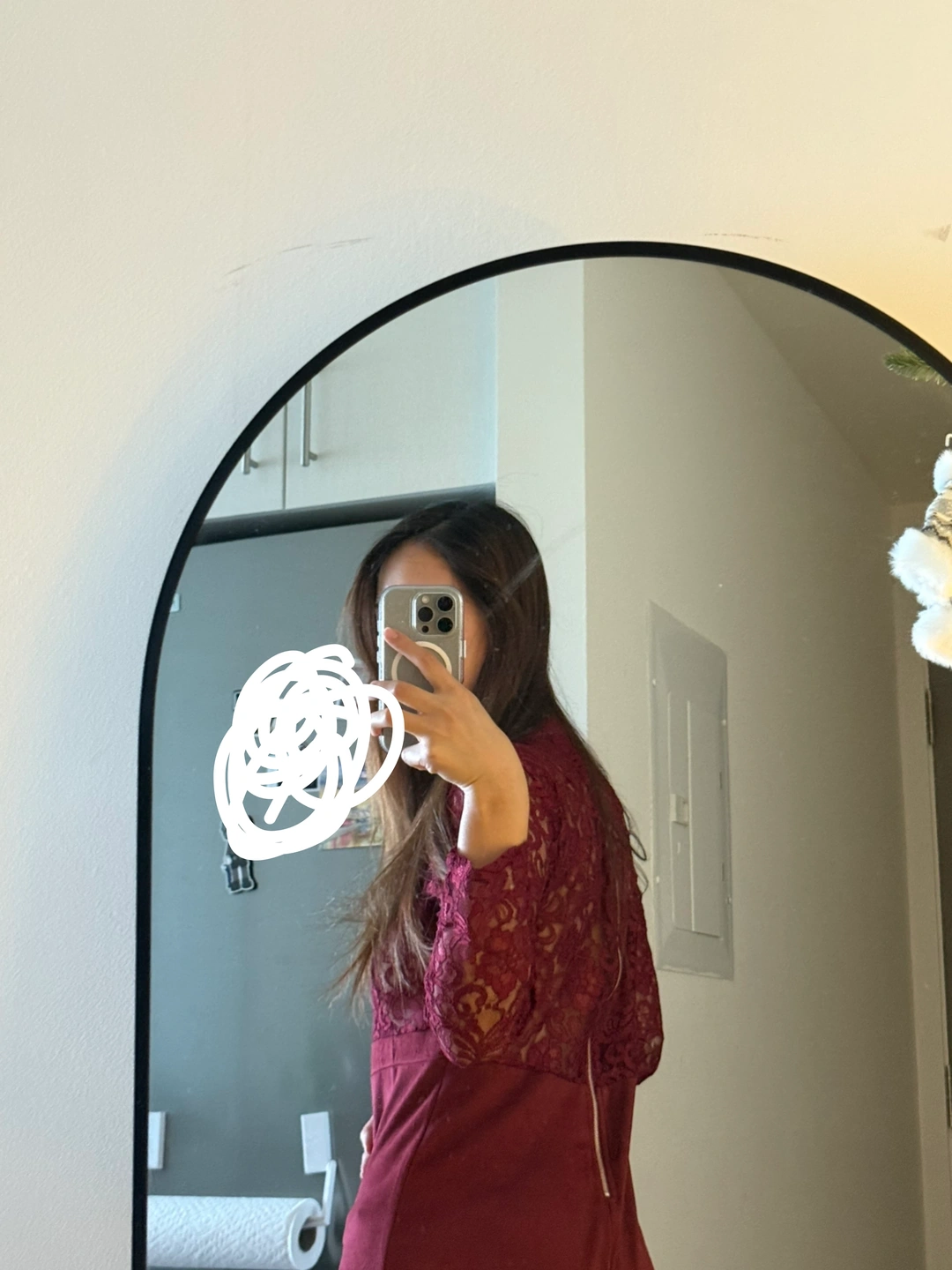 A cute burgundy romper with lace sleeves! It's perfect for a night out or a special occasion. The material is soft and comfortable, and the colour is a rich burgundy. It's in great condition and ready for a new owner!