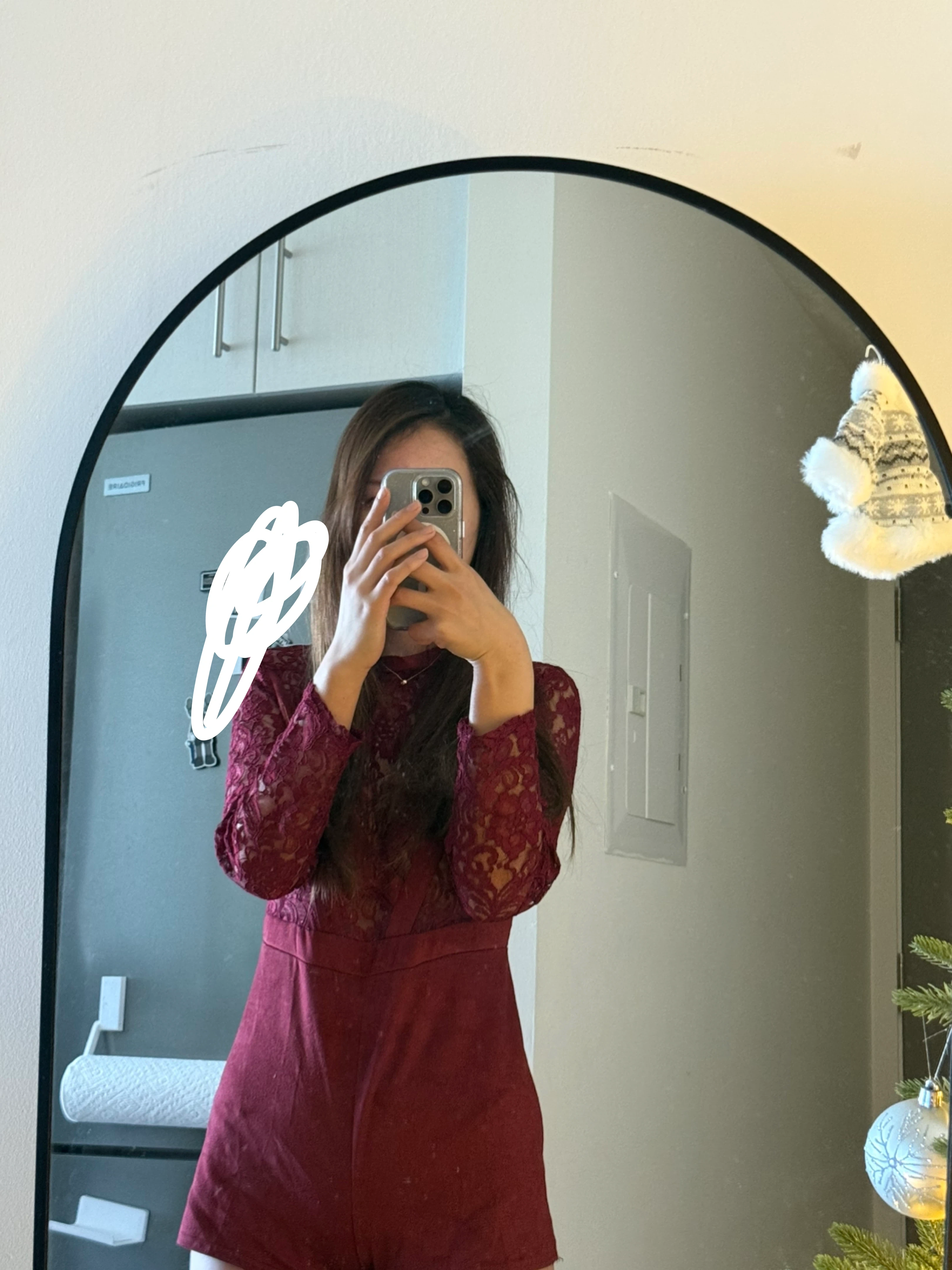 A cute burgundy romper with lace sleeves! It's perfect for a night out or a special occasion. The material is soft and comfortable, and the colour is a rich burgundy. It's in great condition and ready for a new owner!