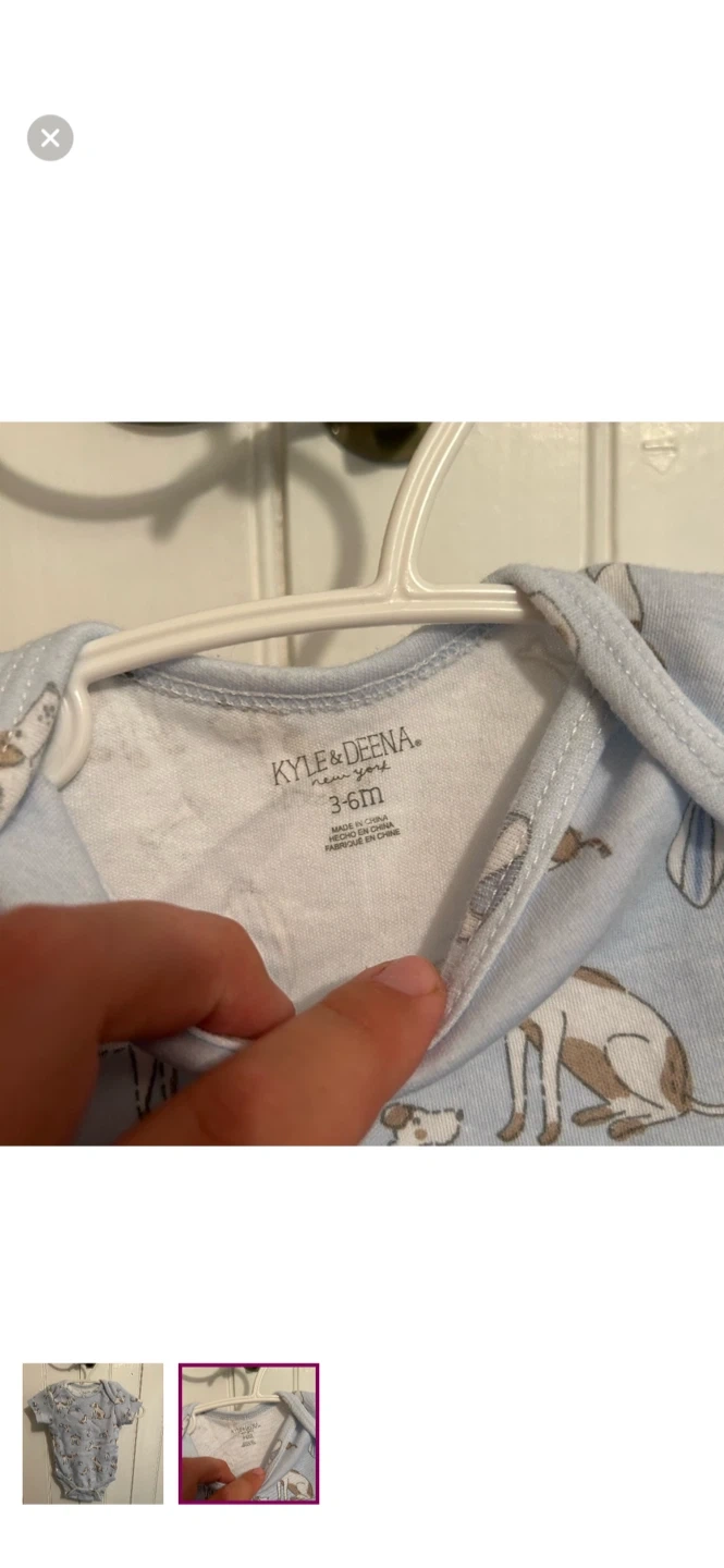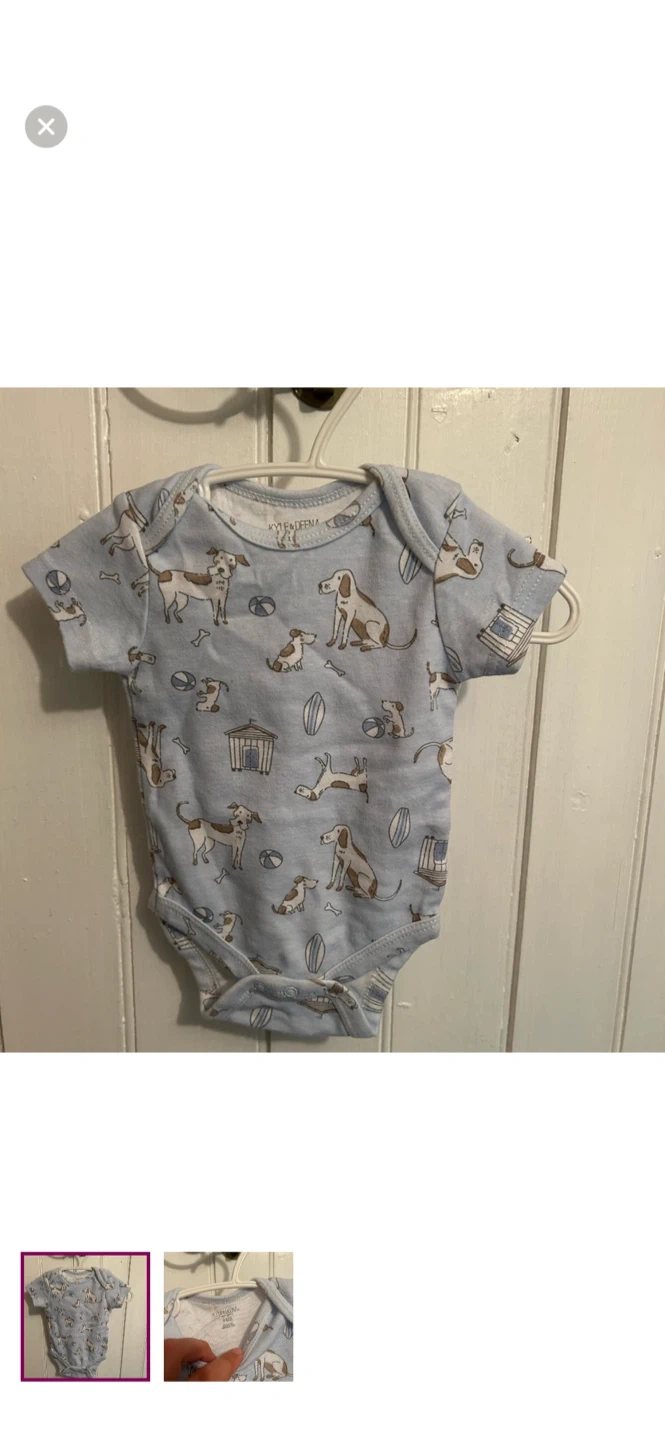 Kyle & Deena brand. Short sleeve onesie. Blue & brown dog print. Size 3/6m. Brand new condition