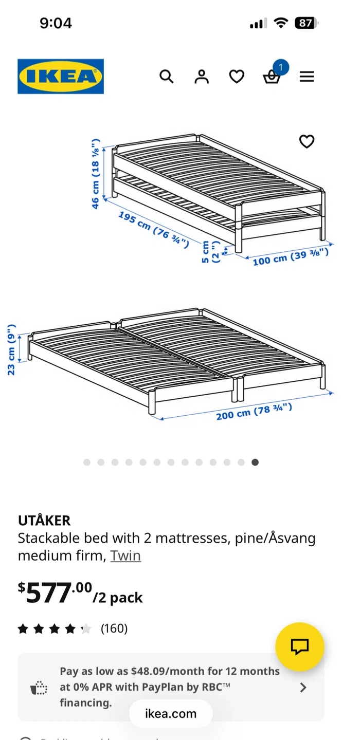 This is the IKEA UTÅKER stackable bed frame with two medium-firm Åsvang twin mattresses. It's made of pine and is designed for space-saving. The frame measures 195 cm long and 100 cm wide. It's great for small spaces or guest rooms!