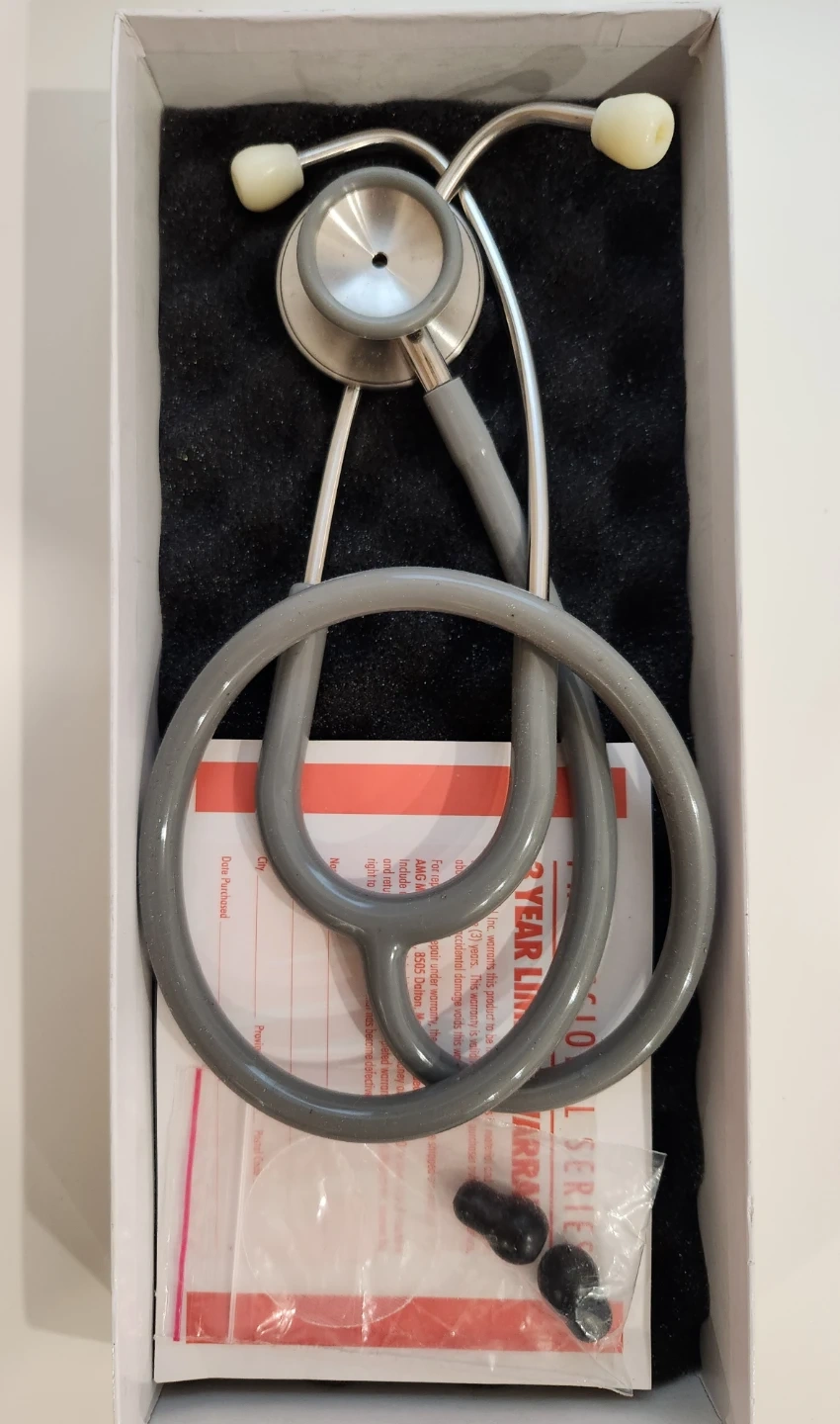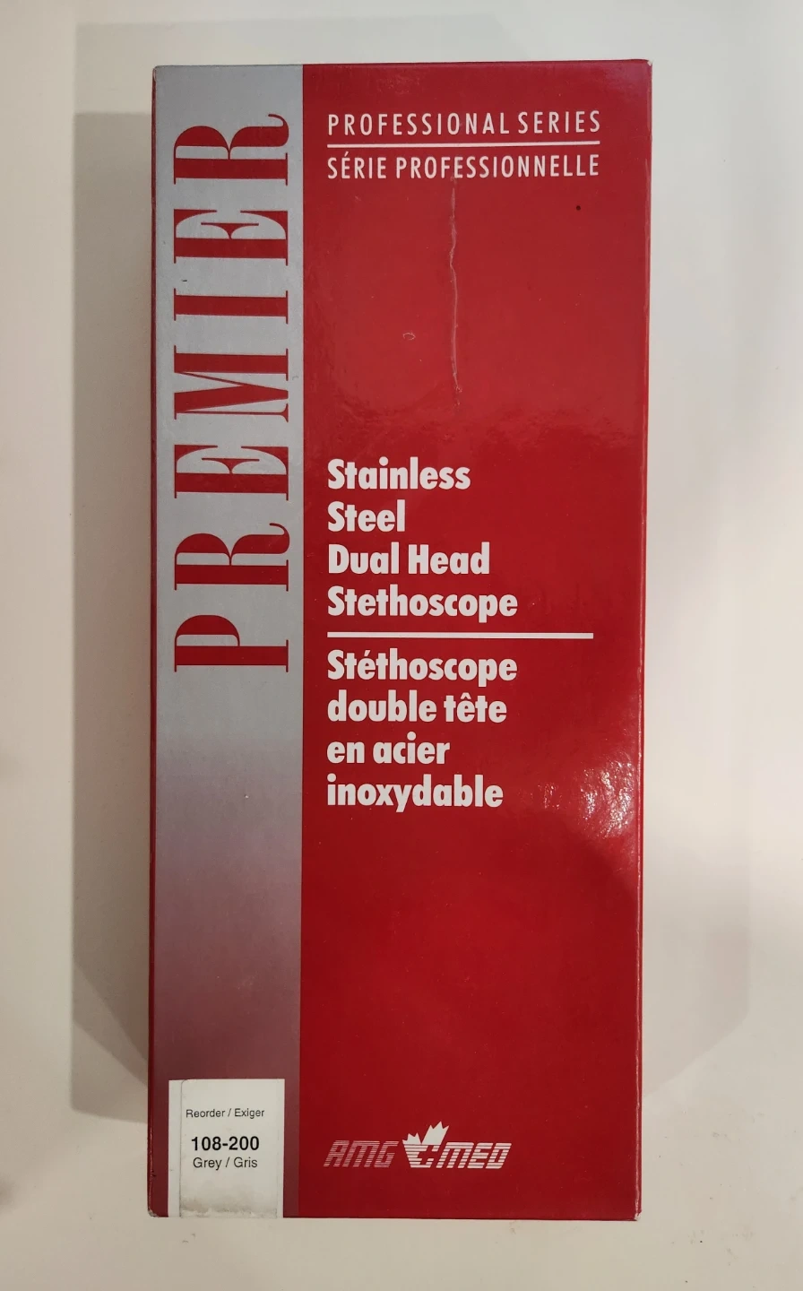 Premier Professional Series Dual Head Stethoscope in grey and made of stainless steel. Includes original box and extra ear tips.