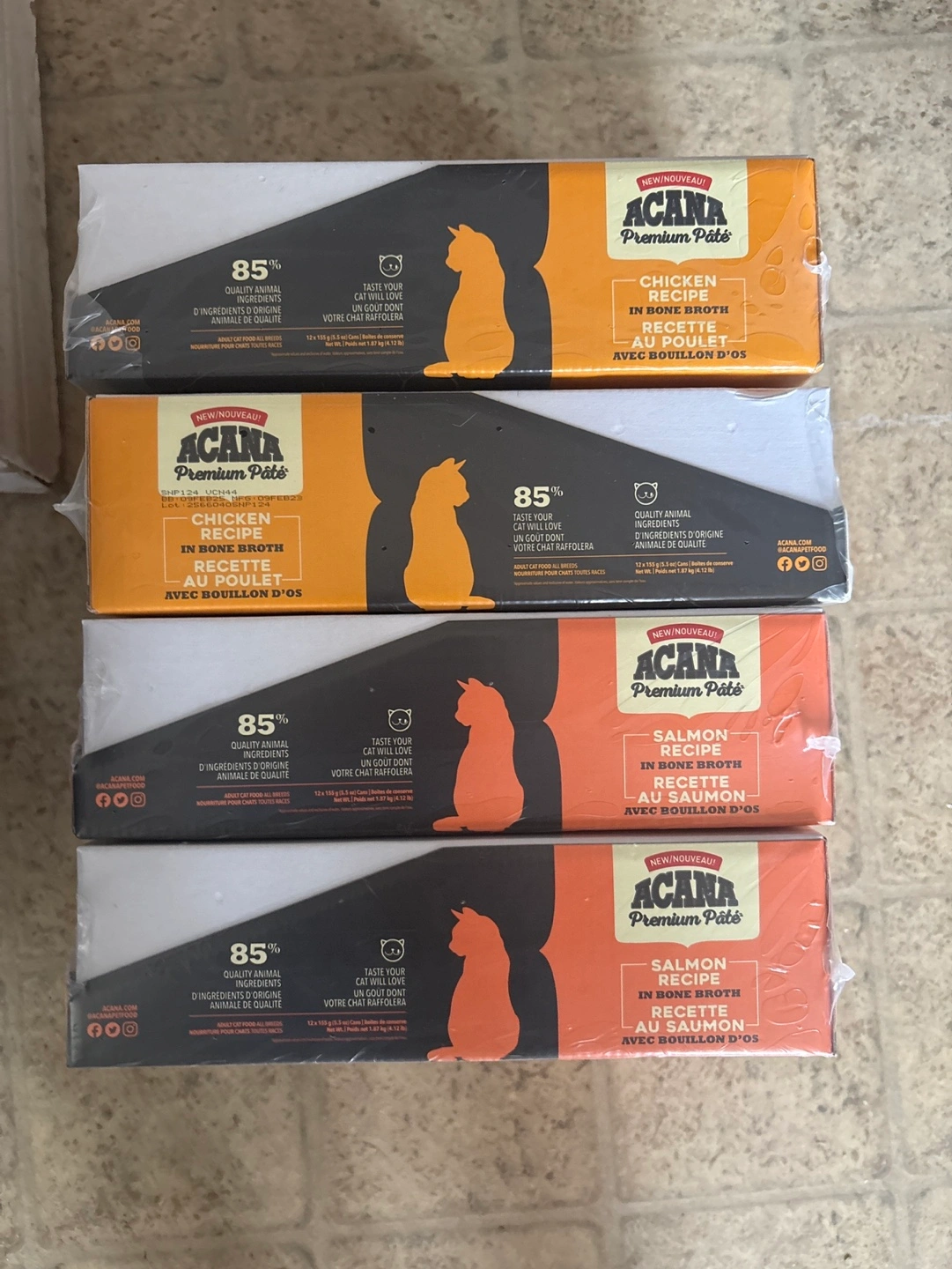 Four boxes of ACANA Premium Pâté wet cat food. Each box contains twelve 155g cans. Flavours include chicken and salmon. Adult cat food, all breeds. Exp Feb 2025 . My cats don’t like pate