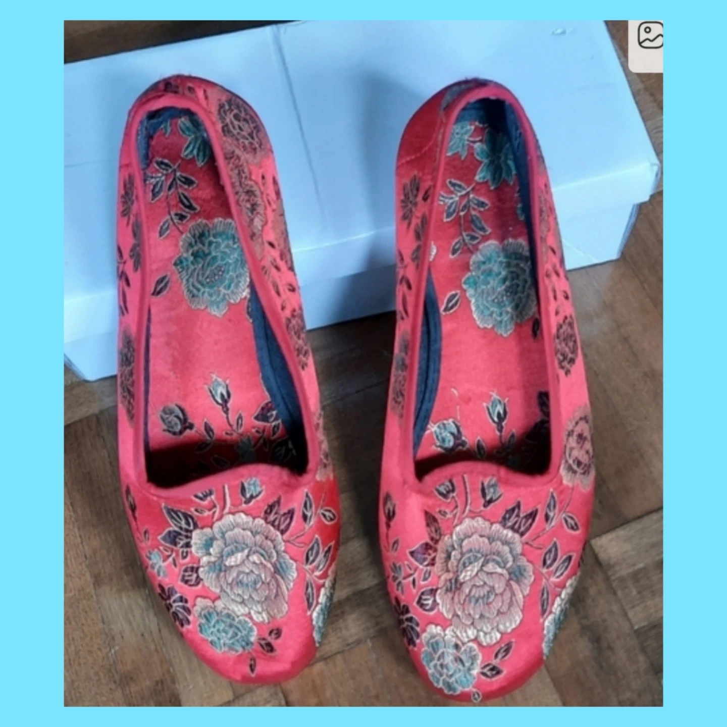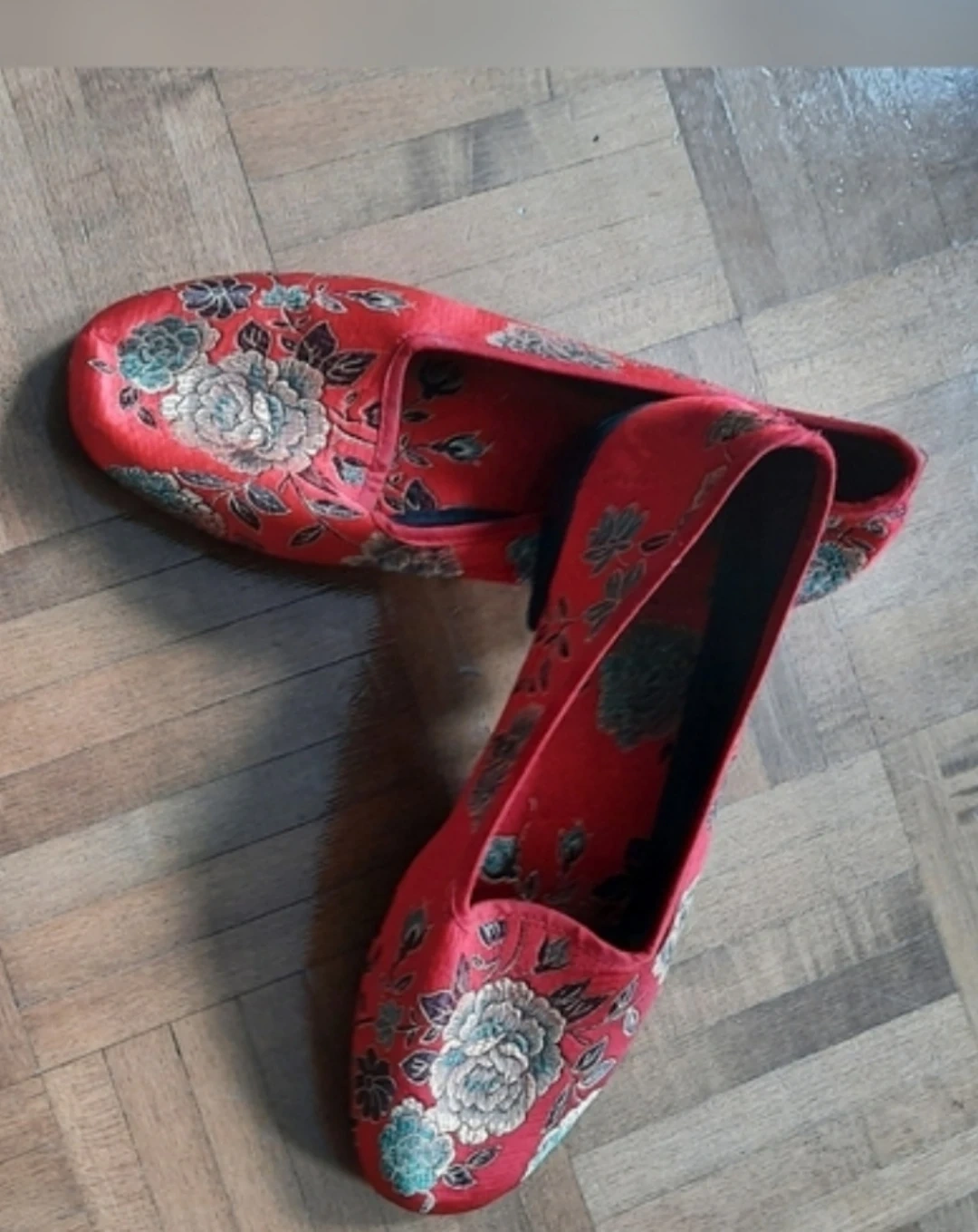 These red ballet flats feature a beautiful floral embroidery design. They're a slip-on style with a rounded toe. Fabric material.