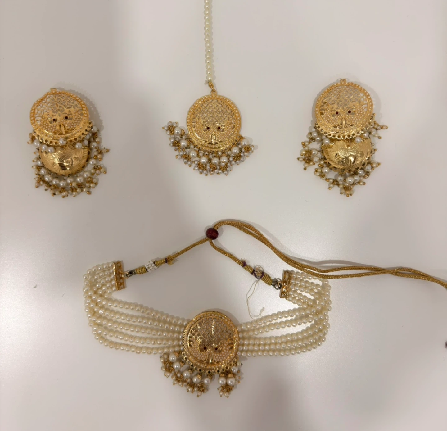 Beautiful gold tone jewellery set featuring pearl embellishments. Includes jhumka earrings and a matching choker necklace. This set offers a traditional Indian aesthetic.
