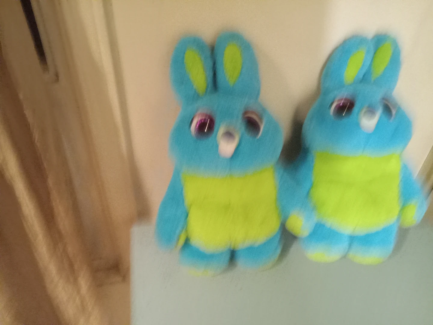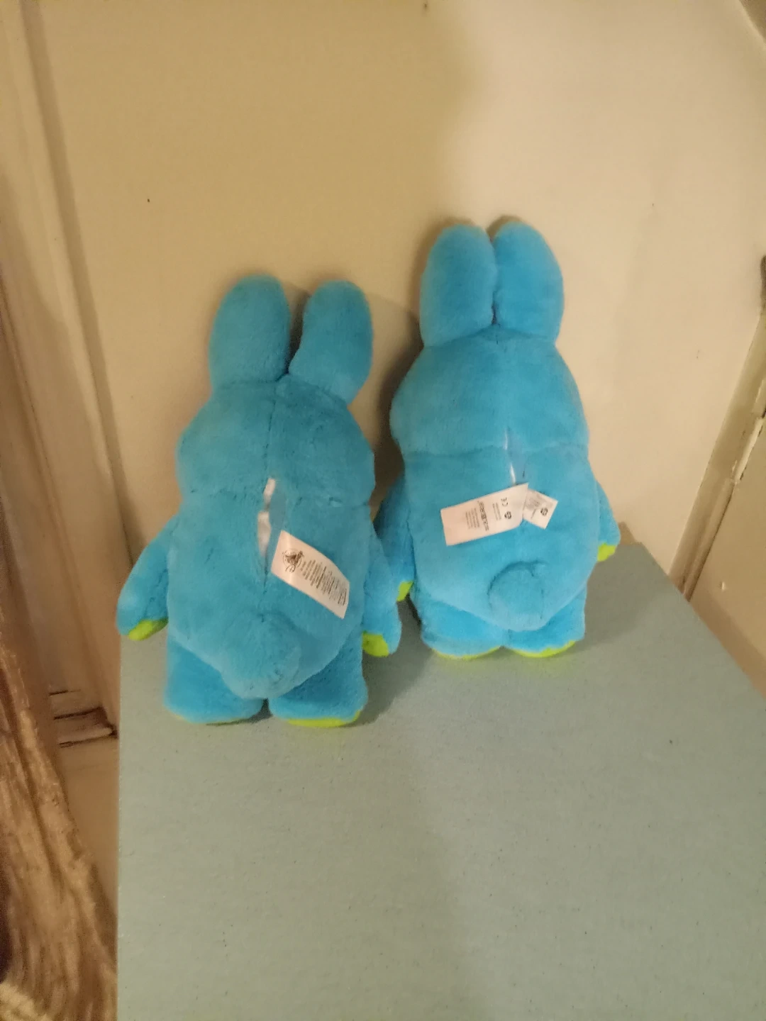 Set of two Ducky and Bunny plush toys from Disney Pixar's Toy Story 4. Soft, fuzzy blue bodies with bright green bellies and purple-accented eyes. They're perfect for fans of the movie! $5.00 each. 2 for -$10.00