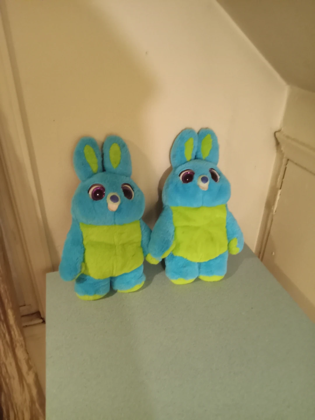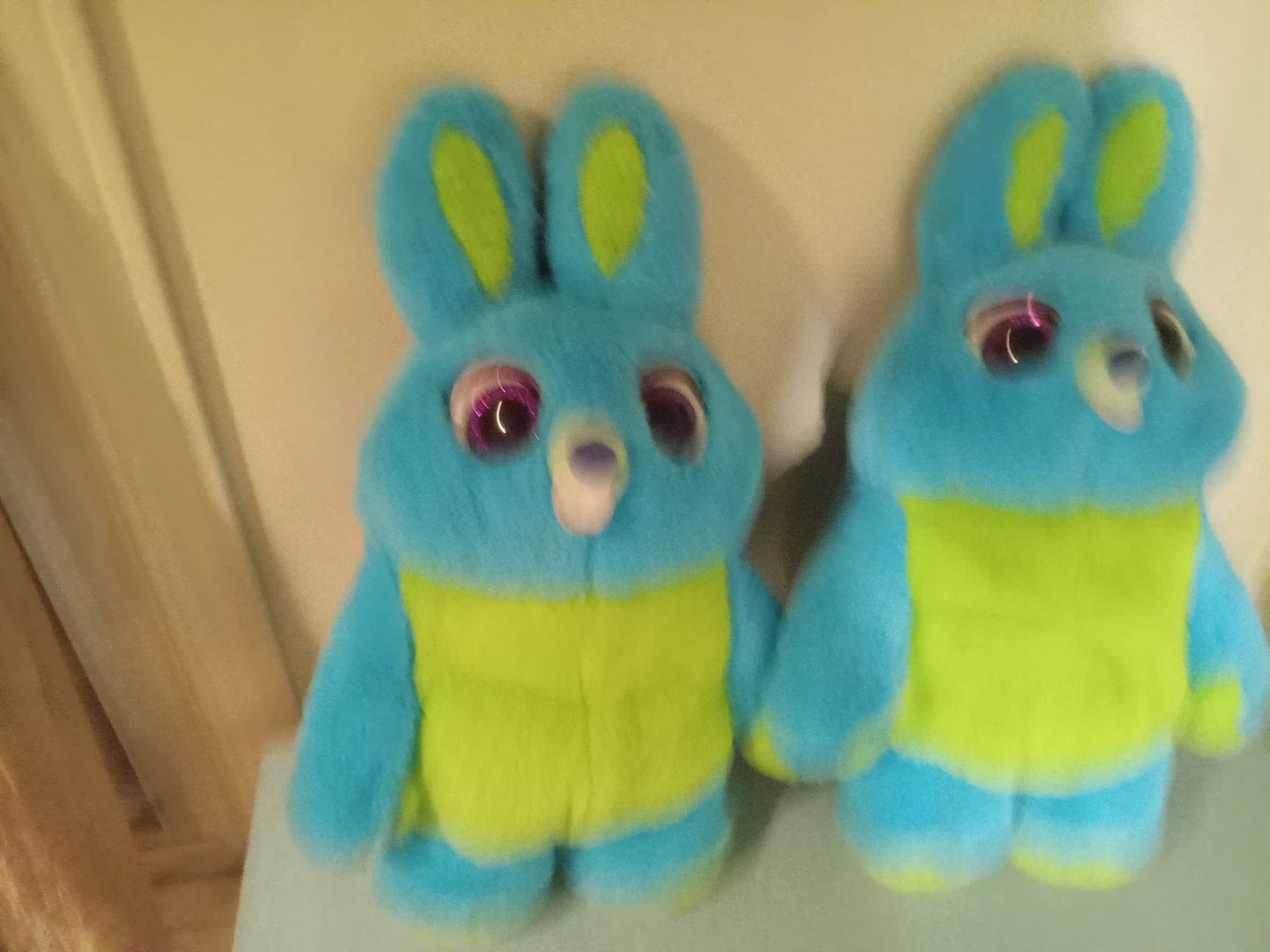 Set of two Ducky and Bunny plush toys from Disney Pixar's Toy Story 4. Soft, fuzzy blue bodies with bright green bellies and purple-accented eyes. They're perfect for fans of the movie! $5.00 each. 2 for -$10.00