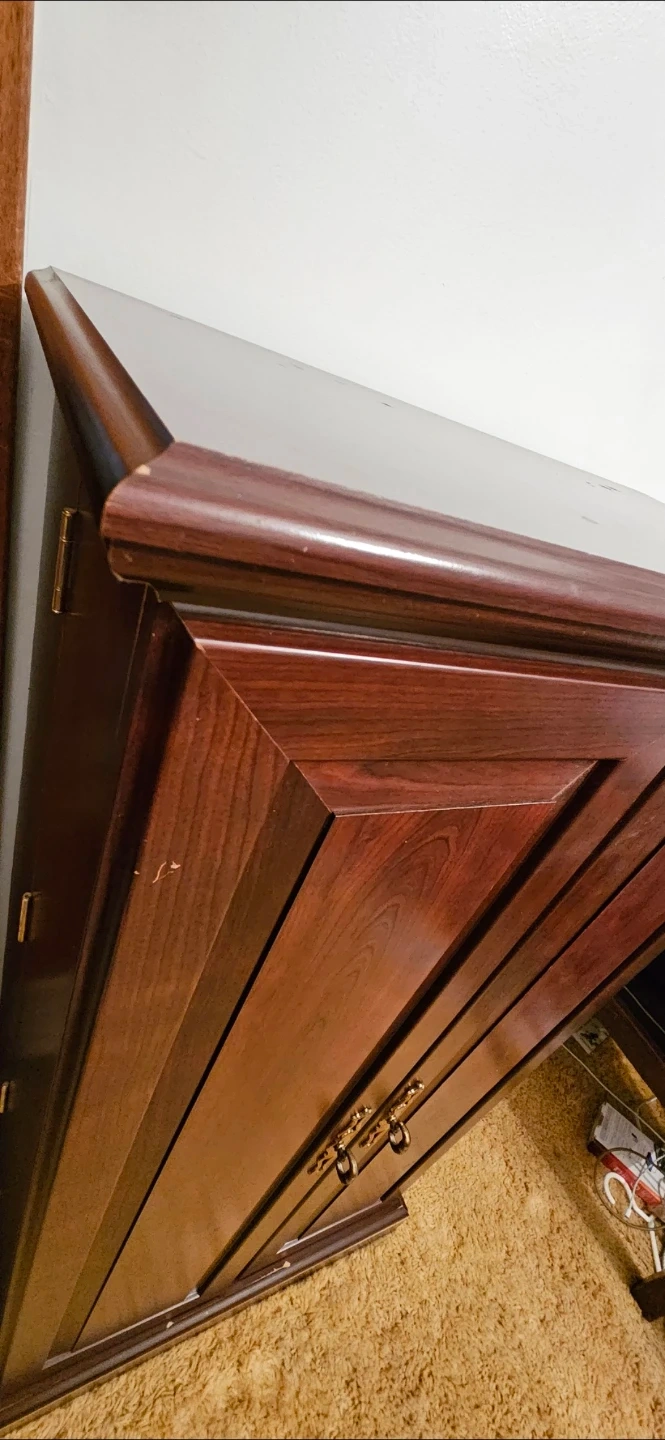 This rich, dark wood media cabinet offers ample storage for your DVD, Blu-ray, and game collection. Its doors keep everything tidy and dust-free. It's a great solution for organizing your entertainment.