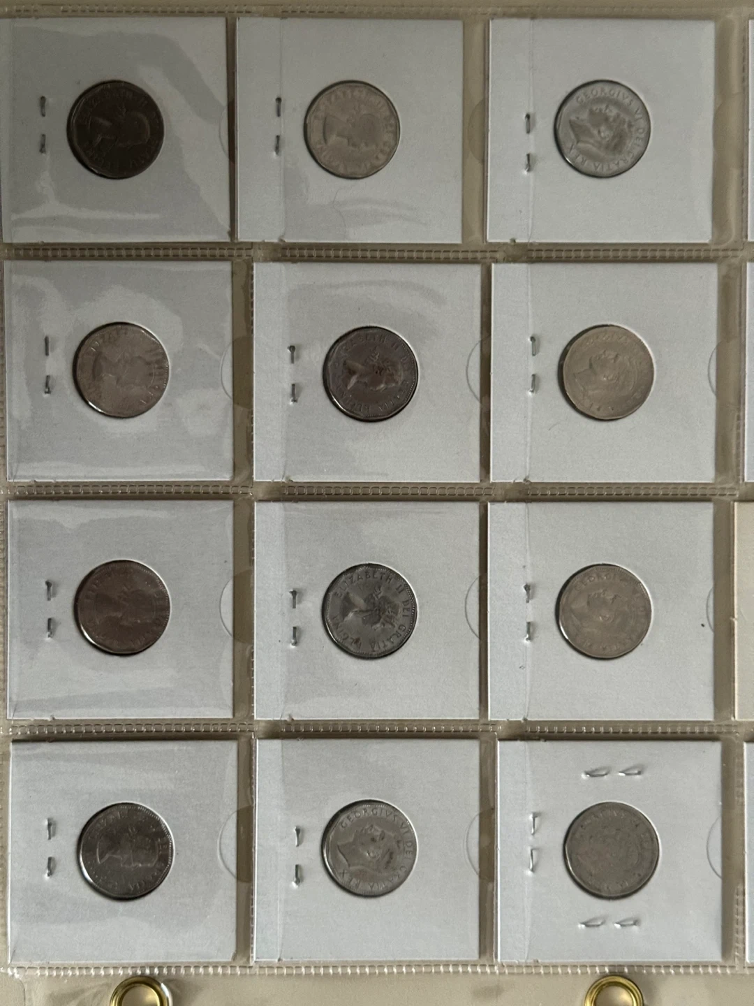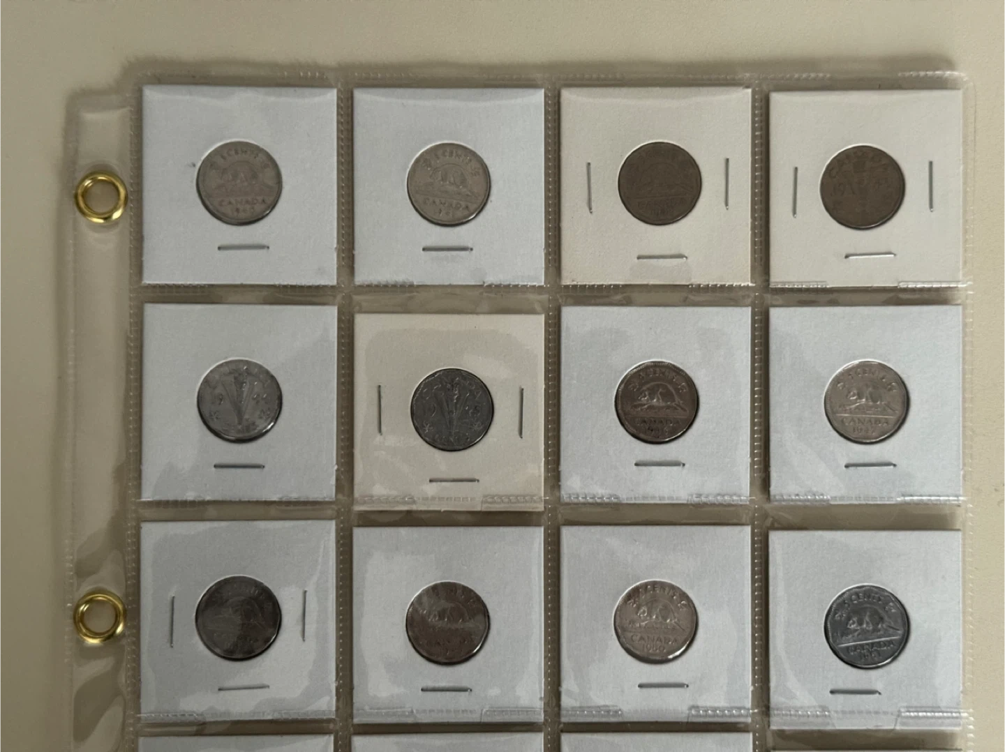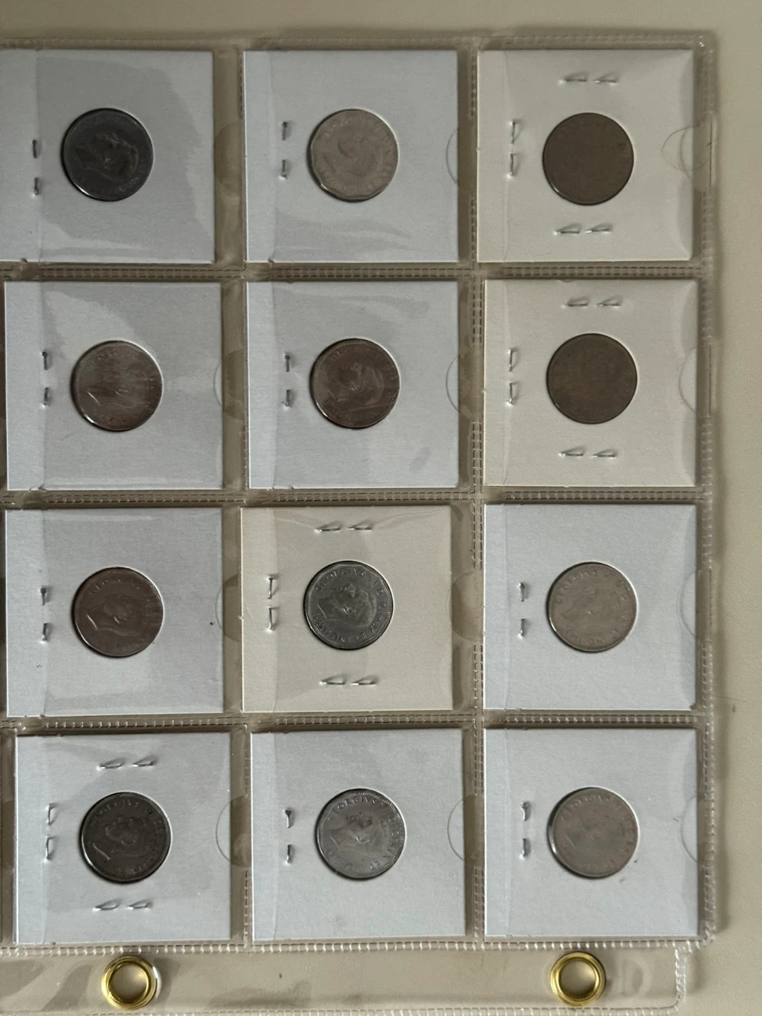 A collection of various Canadian coins displayed in protective sleeves. Features common Canadian currency. Great for starting a coin collection!