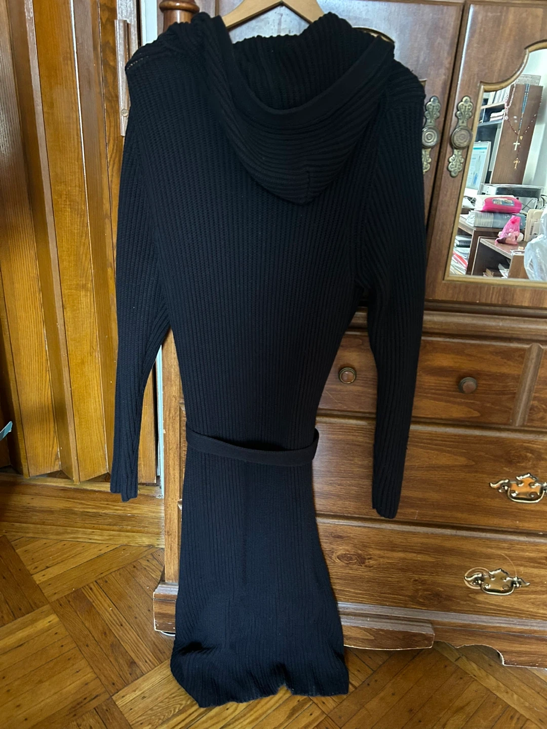 This is a black, ribbed knit, long-sleeved cardigan dress. It features a hood and a matching tie belt. The dress is midi-length with a flowing hemline.