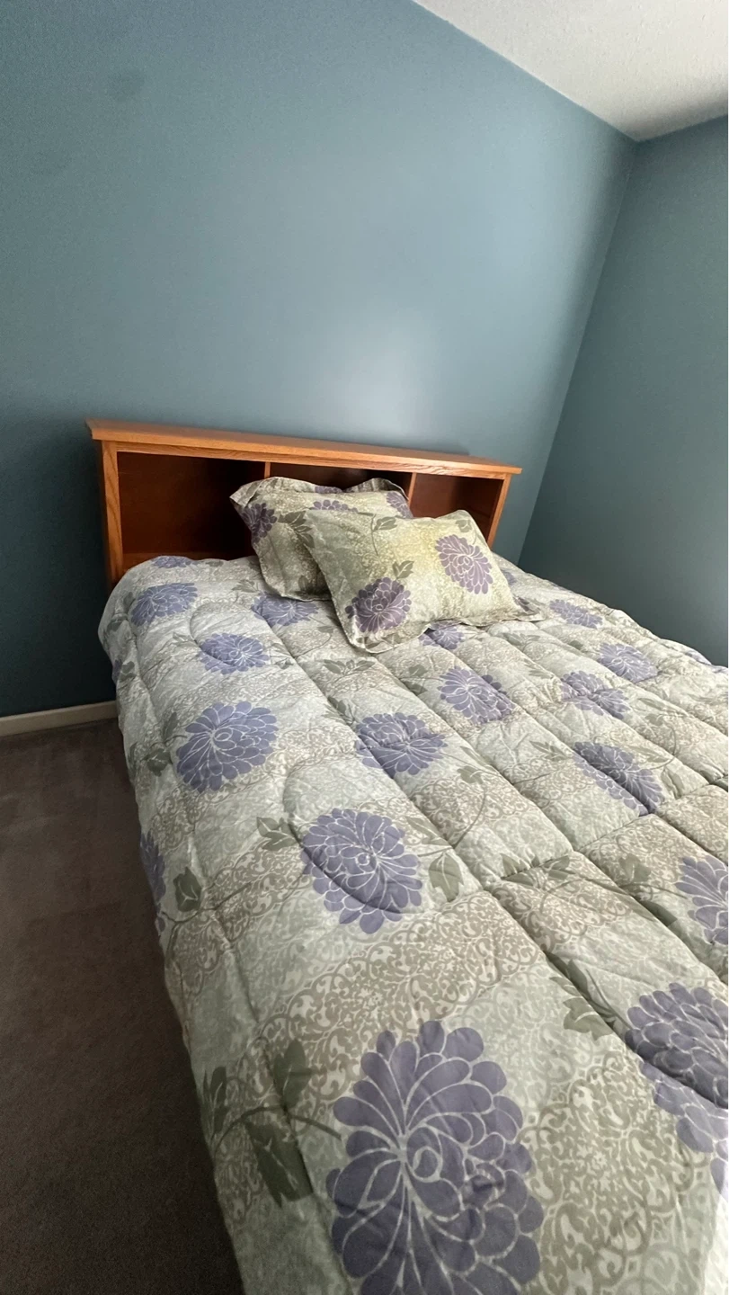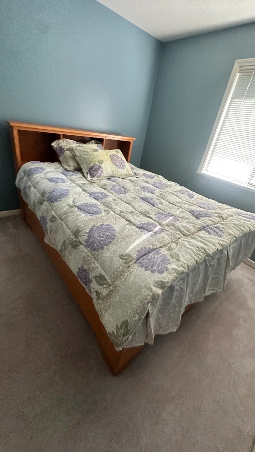 Queen size wooden bed frame with a built-in headboard featuring storage shelves. Includes the wooden frame, headboard.