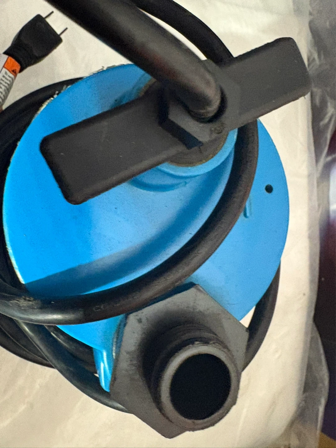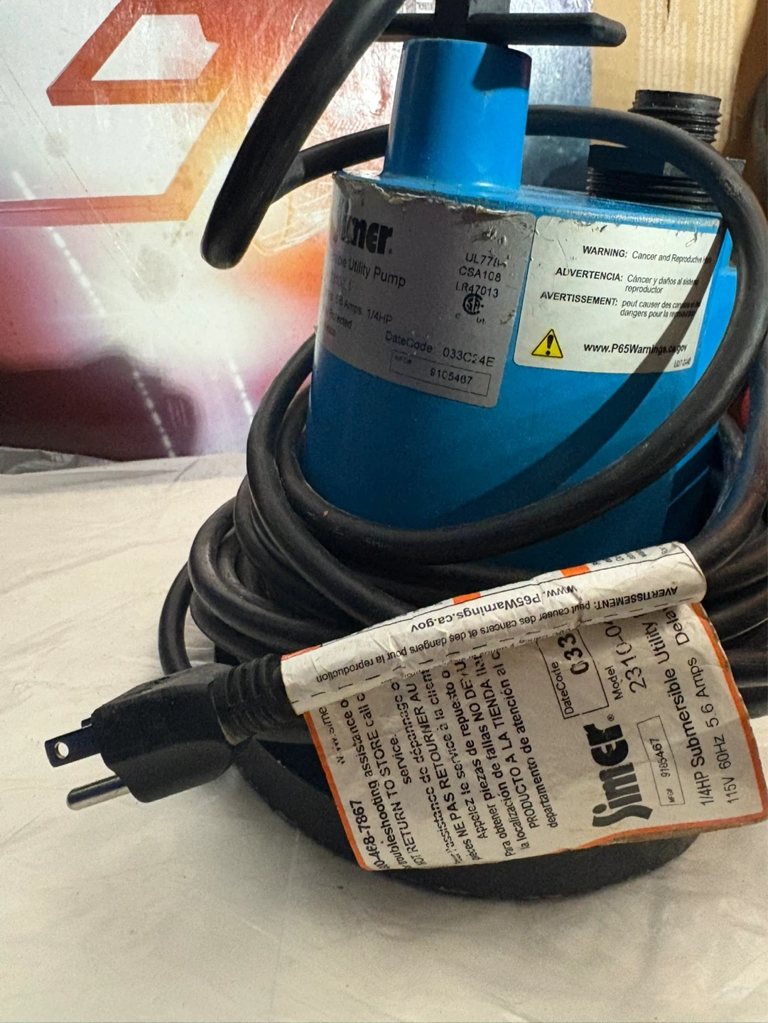 This is a Simer 1/4 horsepower submersible utility pump. It operates at 115V, 60Hz and uses 5 Amps. Made in Mexico.