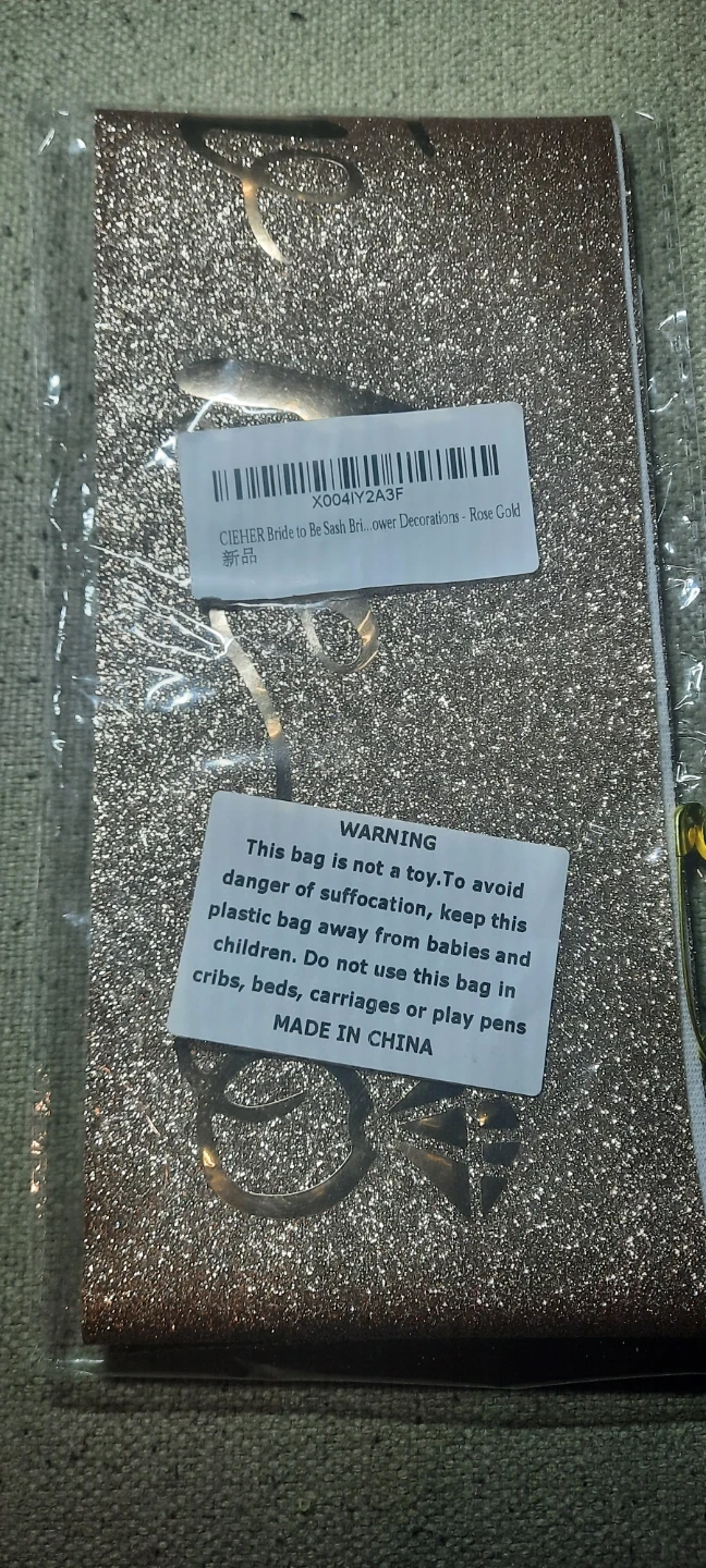 This "Bride to Be" sash and flower decoration set is perfect for any bridal event. It's in a lovely rose gold colour with a glitter finish. The set includes the sash and a flower accessory, along with a safety pin for securing it. It's a fun way to celebrate the bride-to-be!