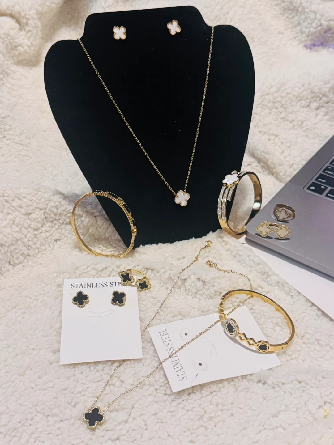 Elegant gold-tone necklace and matching earrings featuring a clover design. Some pieces are marked 'Stainless Steel'. A lovely set for everyday wear or special occasions!