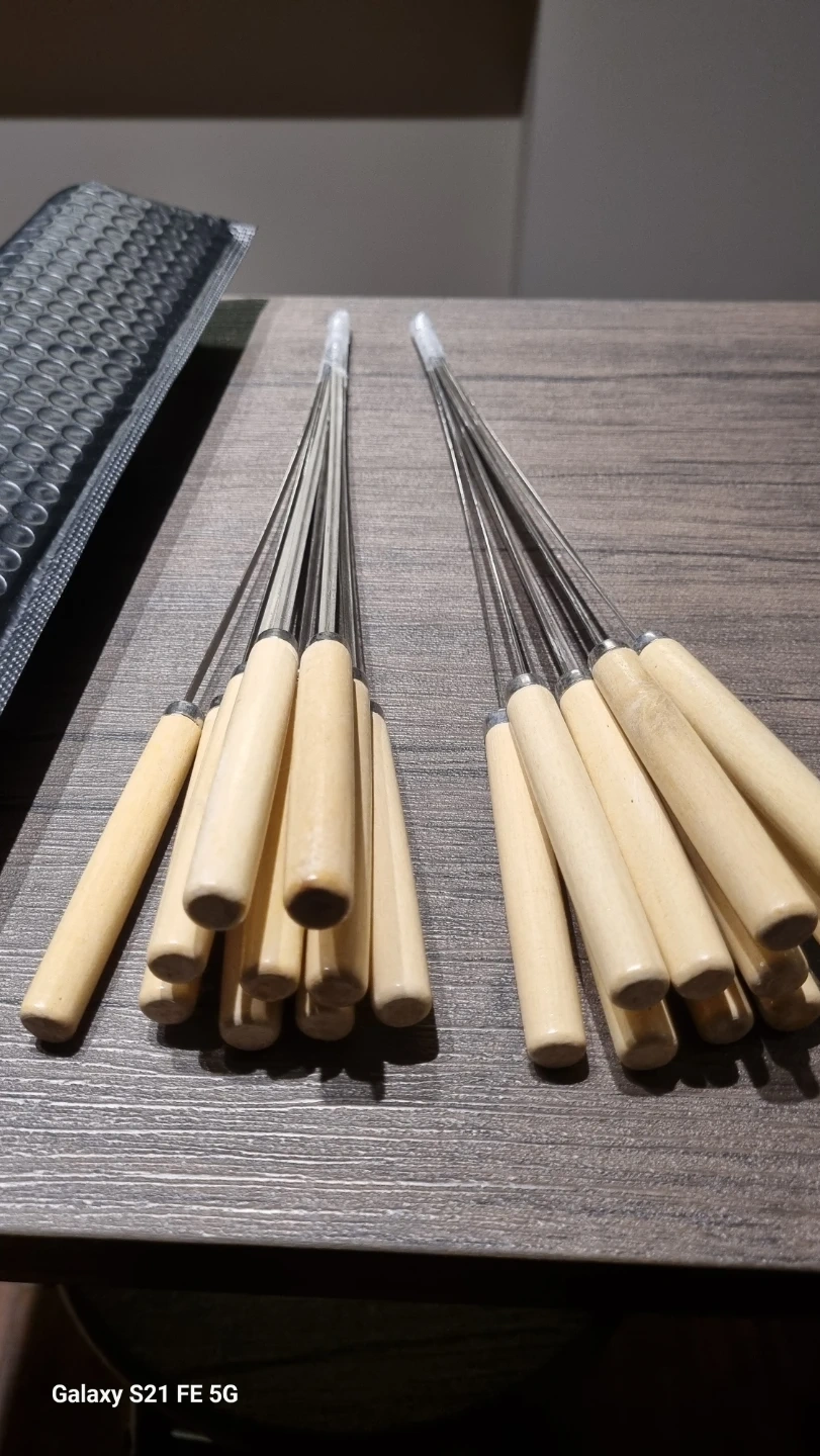 20 stainless steel skewers with natural wooden handles. They're great for grilling or roasting food. The metal portion is roughly 6 inches long.