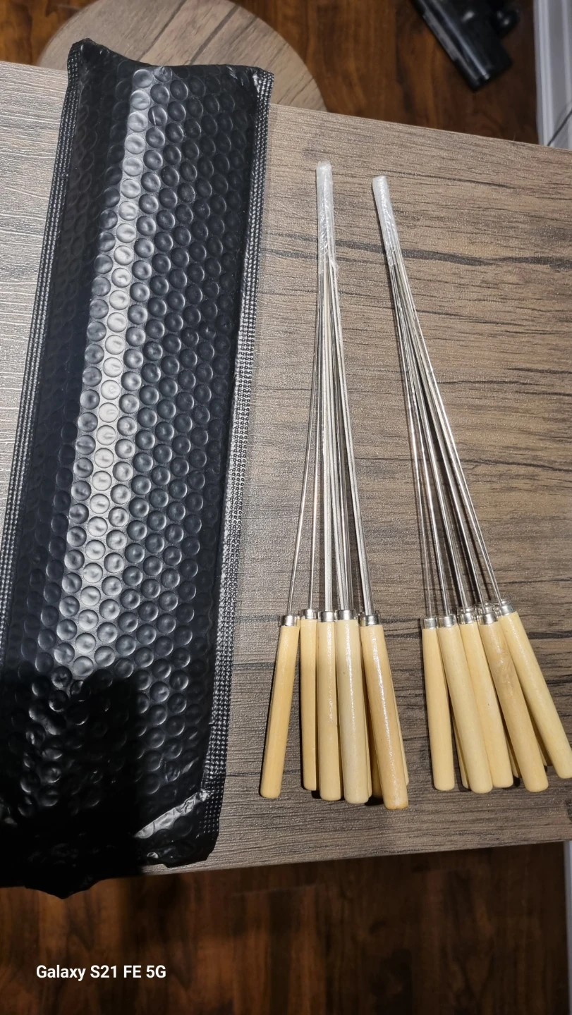20 stainless steel skewers with natural wooden handles. They're great for grilling or roasting food. The metal portion is roughly 6 inches long.
