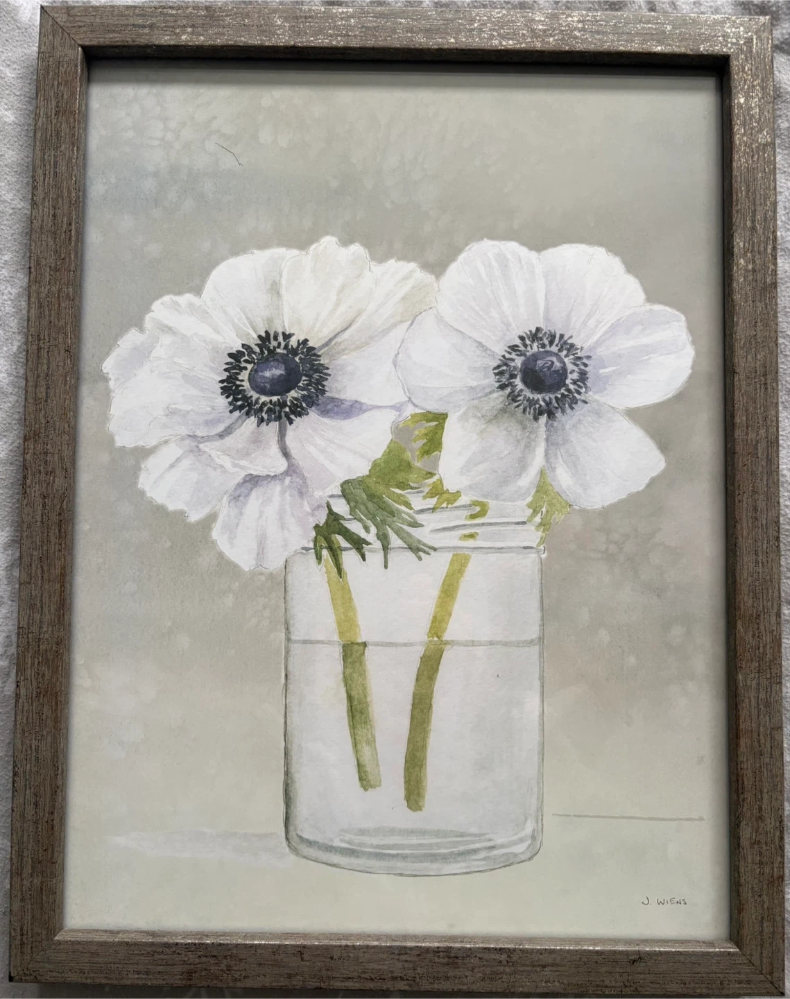 This framed watercolor art depicts white anemones in a glass jar. The artwork is signed 'J. Wiens'. It's framed in a rustic grey wood-look border. This piece adds a touch of nature to any room! Frame size: about 17" x 13".