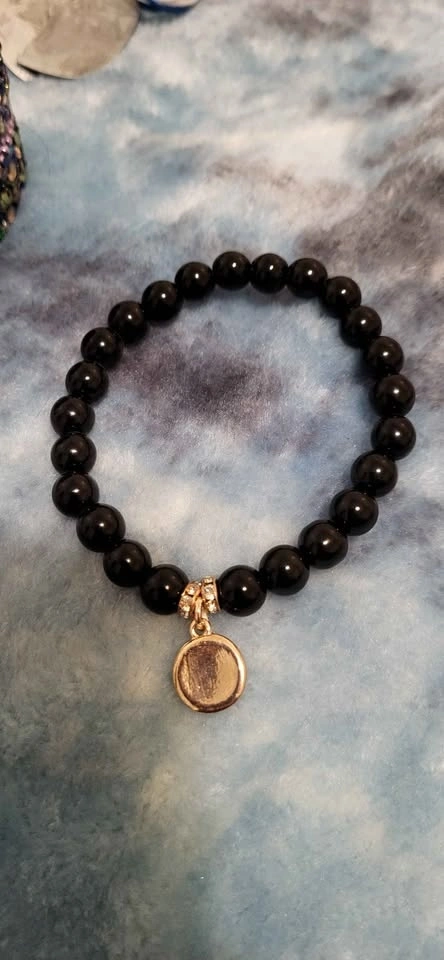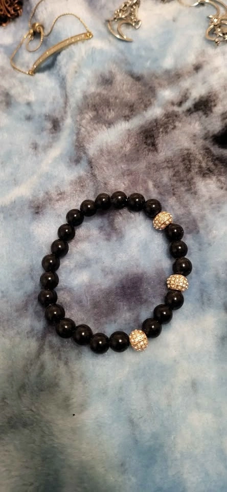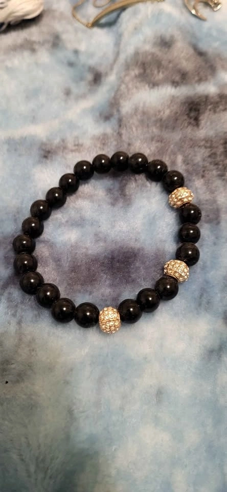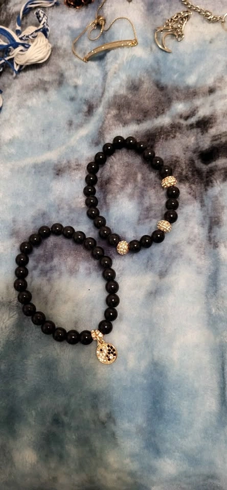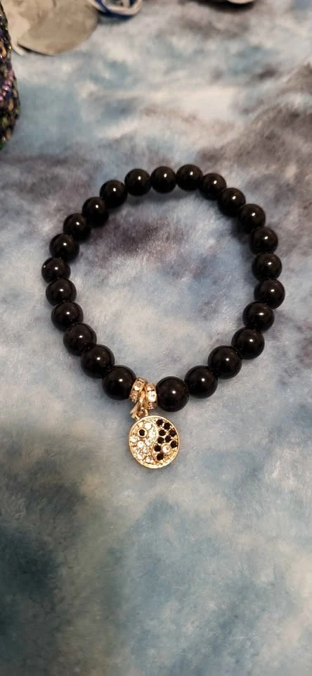 Sparkly black beaded bracelets. One has a yin-yang charm with clear and black rhinestones. The other has three sparkly rhinestone spacer beads. Both are stretch bracelets.