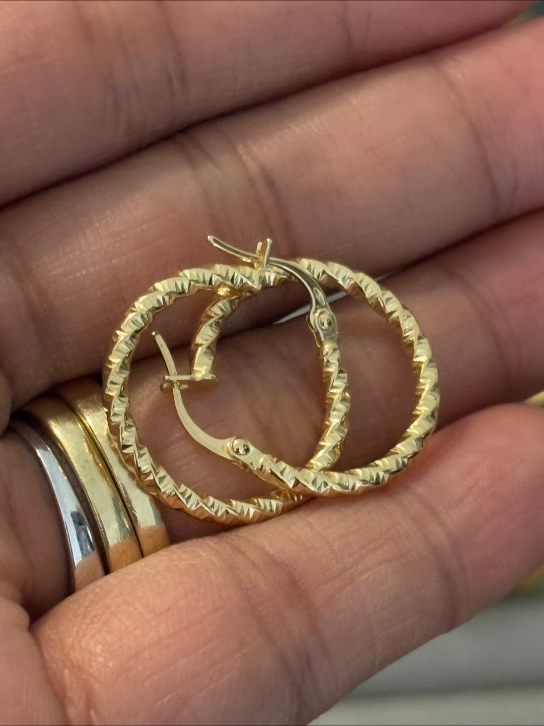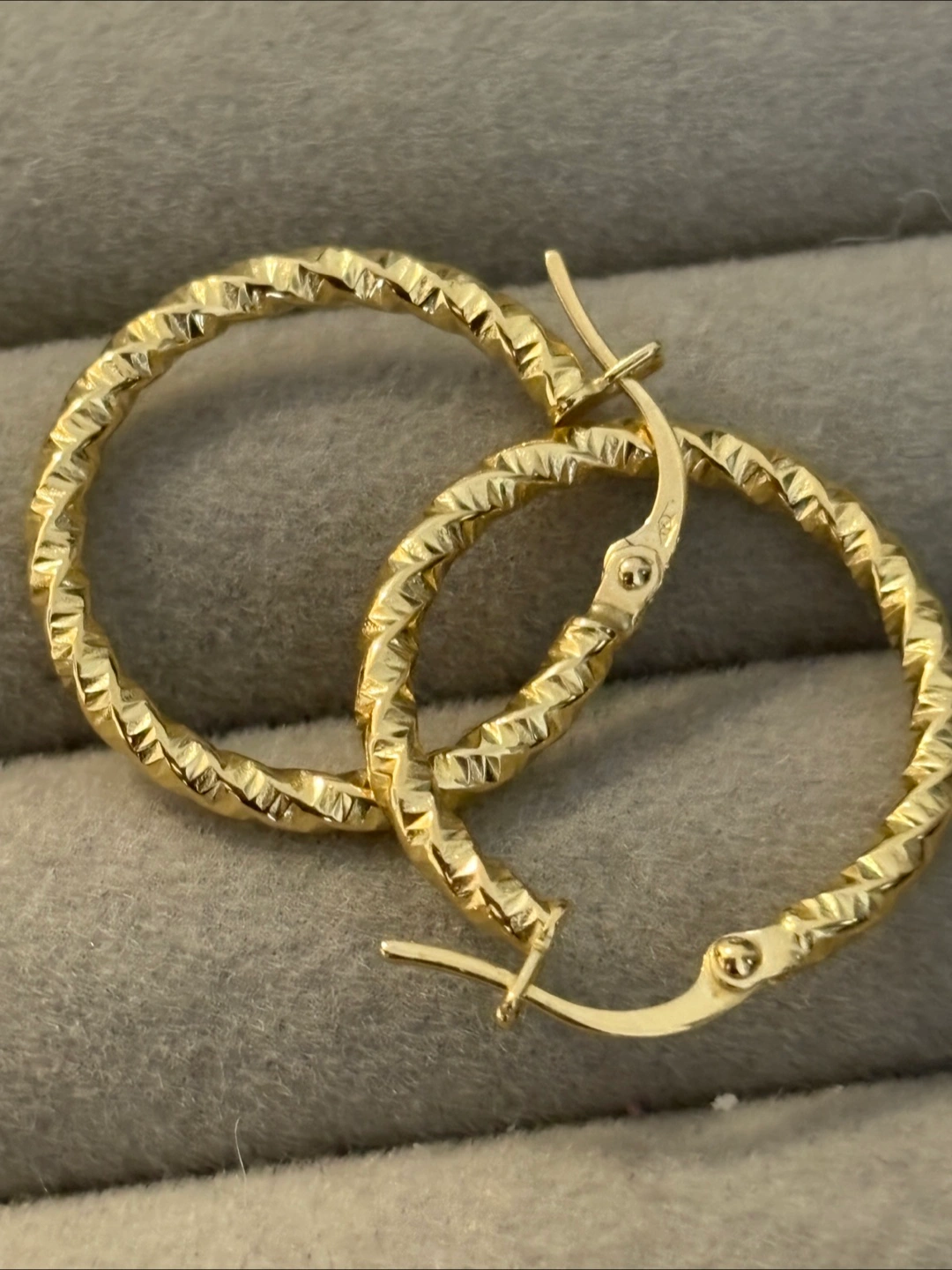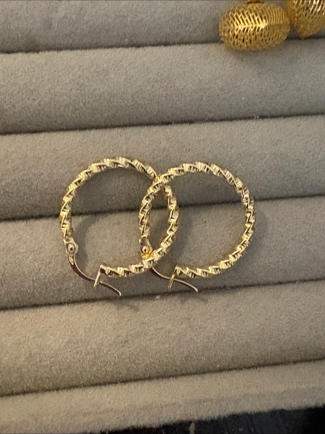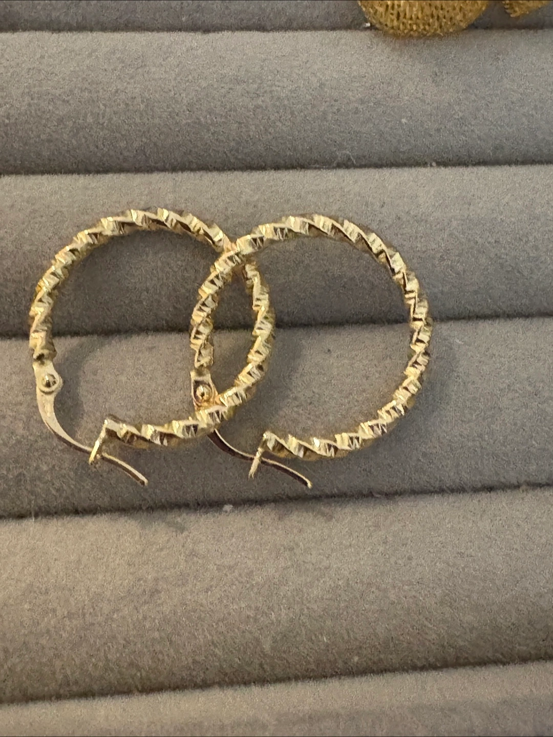 Selling a pair of 18K gold hoop earrings! They have a twisted design, giving them a unique look. 18K Saudi Gold