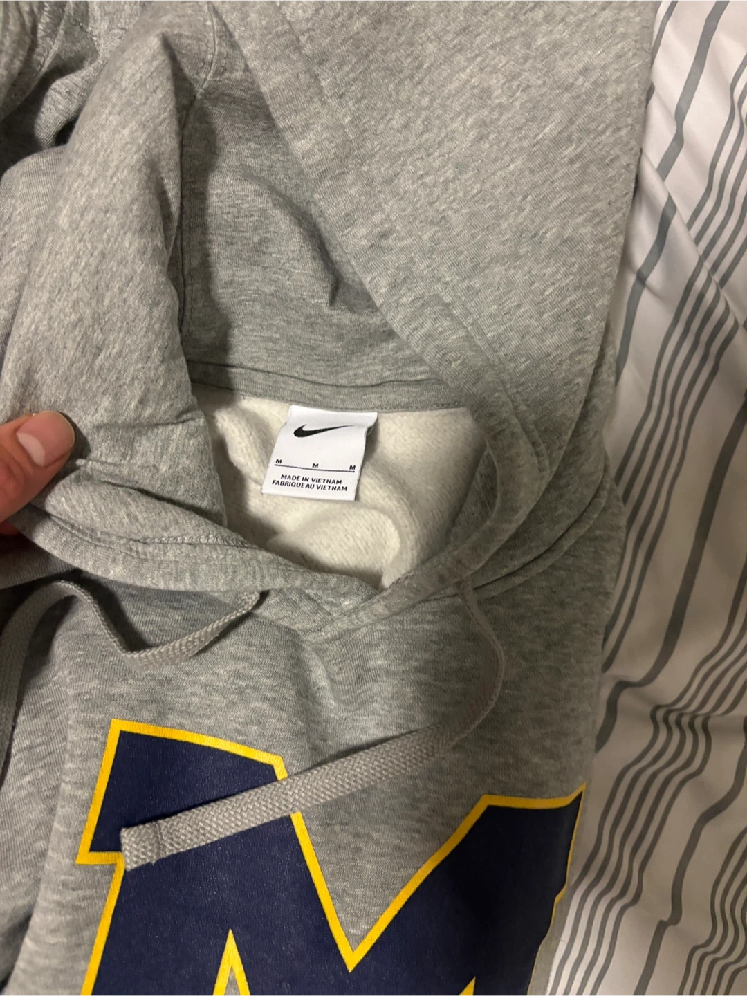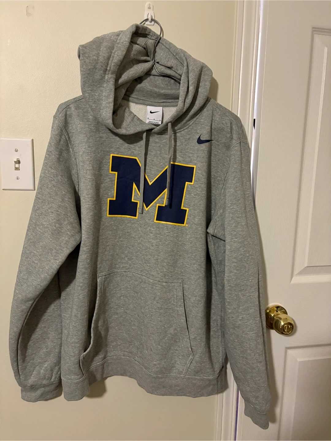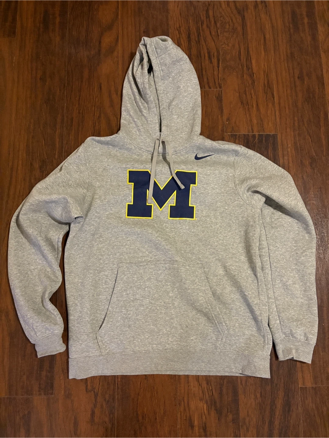 Grey Nike pullover hoodie featuring the Michigan Wolverines "M" logo on the front. It's made from a comfortable cotton blend. Size medium.
