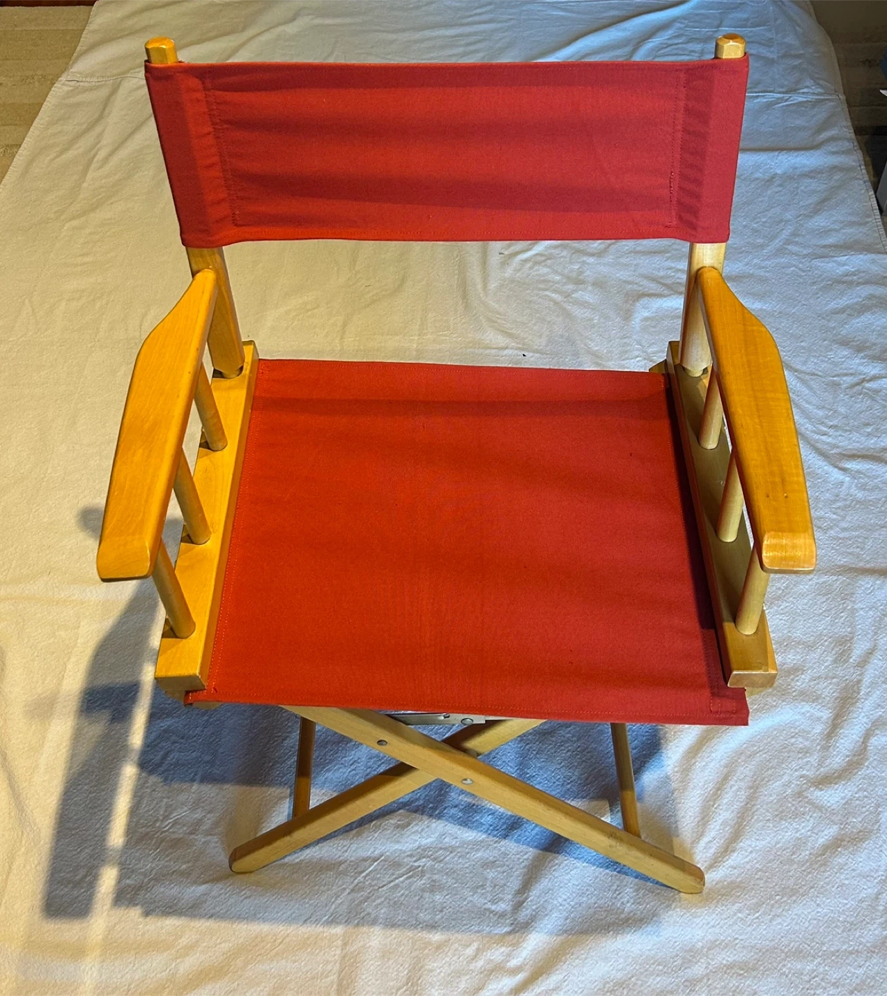 director's chair with a vibrant red canvas seat and back. The frame is made of sturdy wood. good condition and ready for its next production!