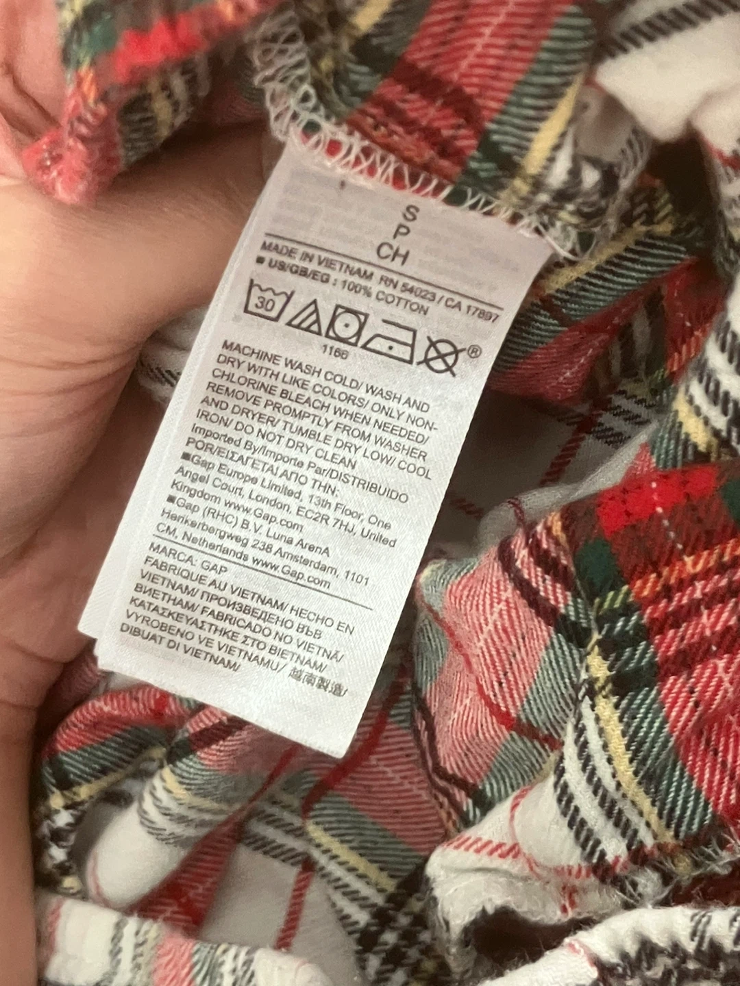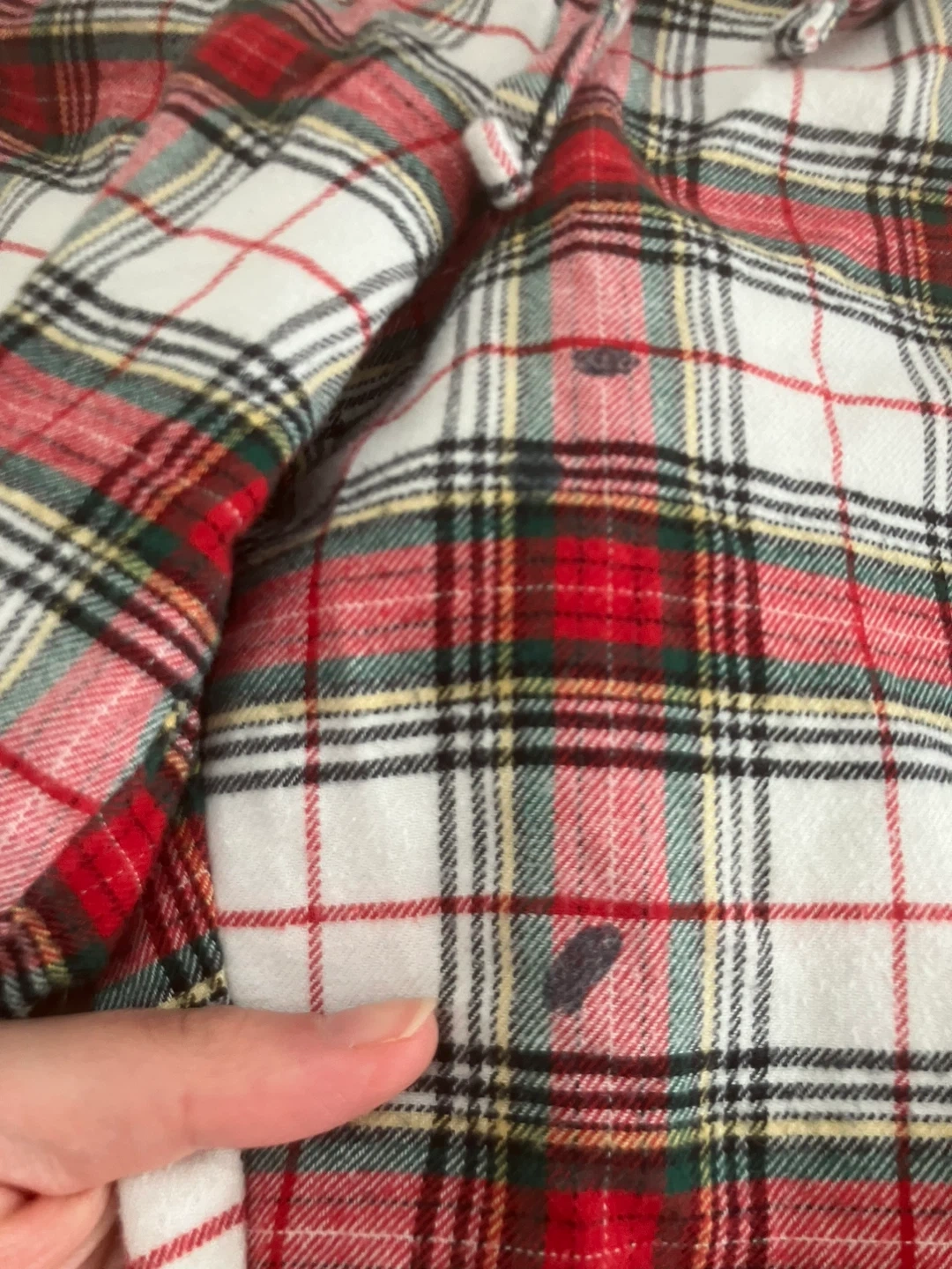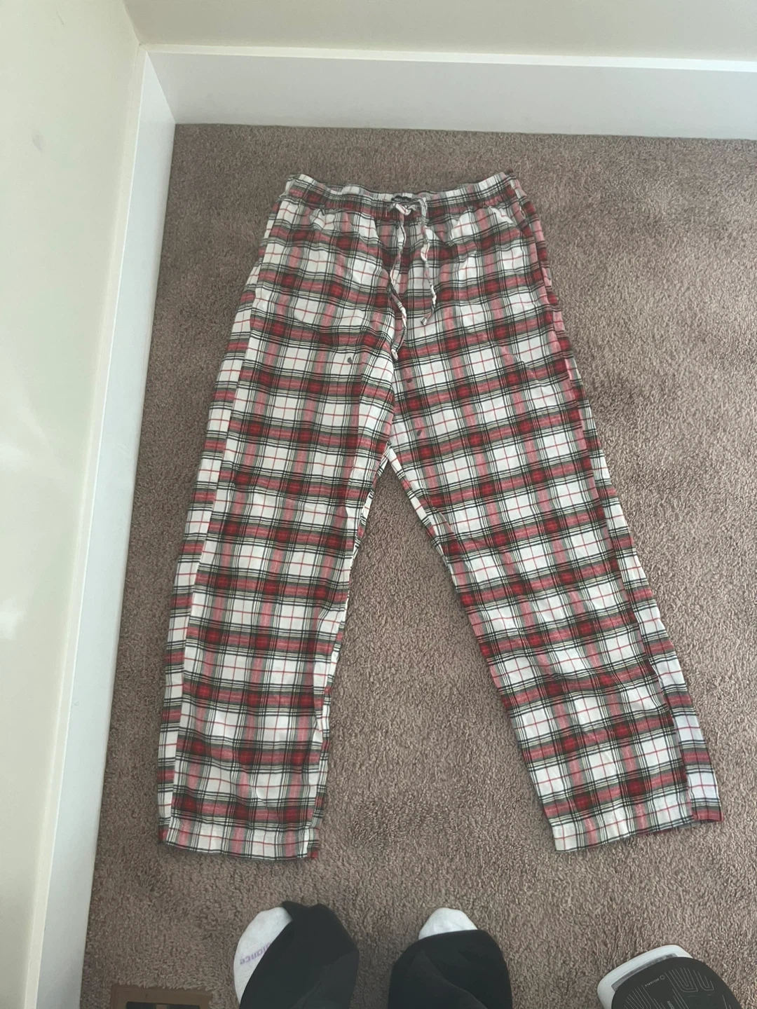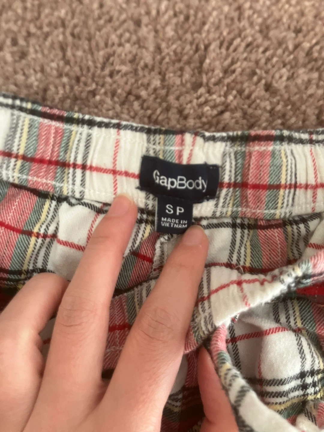 Comfortable GapBody pajama pants in a classic red, white, and green plaid. Size S. Made from a soft fabric for a cozy feel. Elastic waistband with drawstring. Has a small paint stain on the front but isn’t noticeable and is easy to cover with a longer shirt.