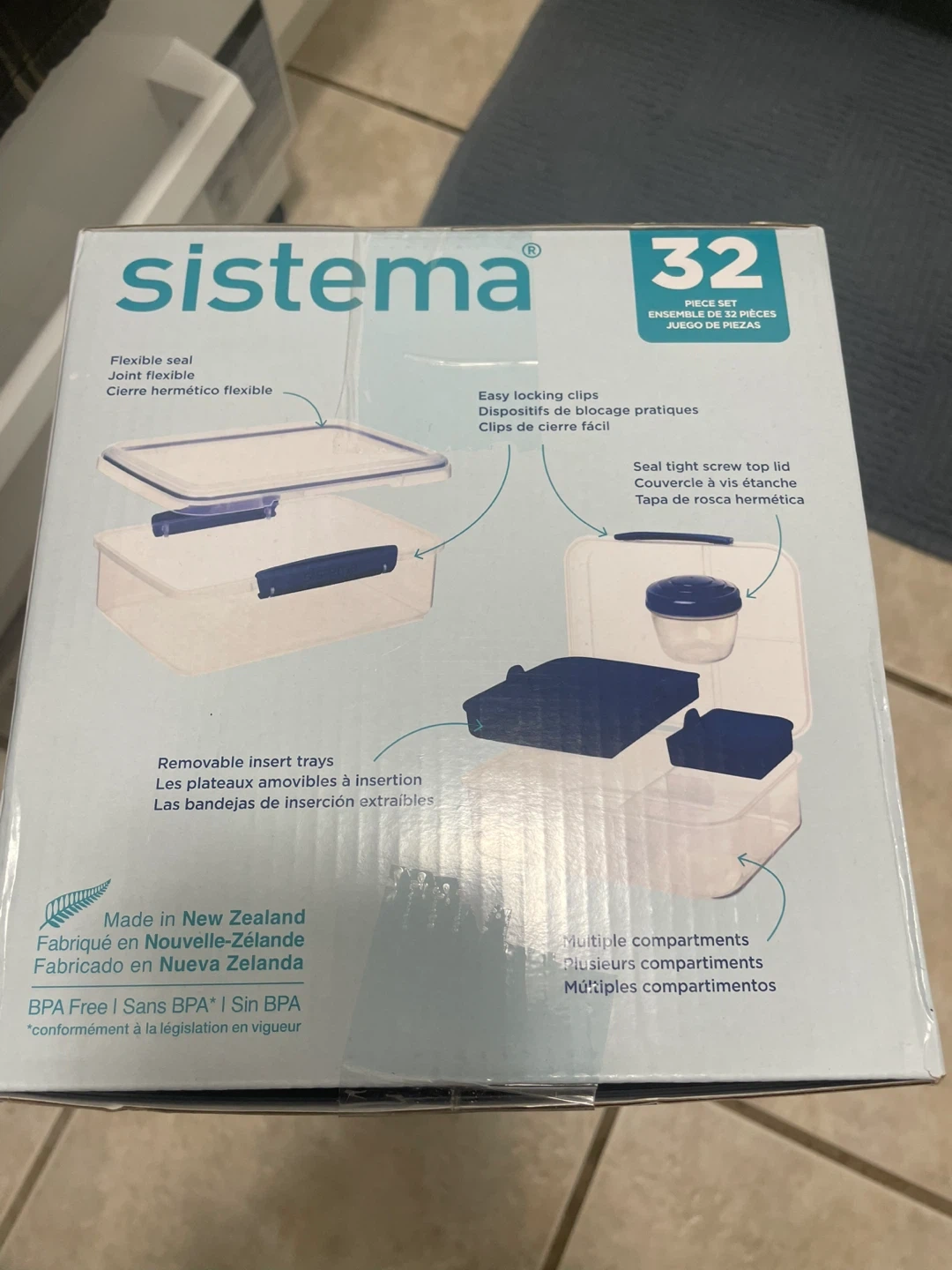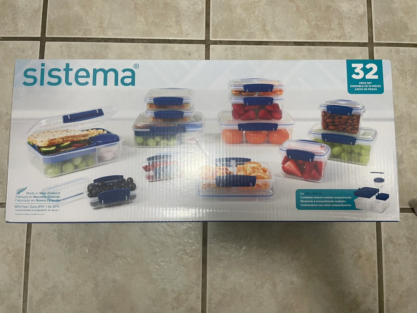 Selling a Sistema 32-piece food storage container set. It comes with multiple containers with lids. The set includes containers of various sizes, ranging from 200ml to 2L. The containers feature easy locking clips and flexible seals. BPA free