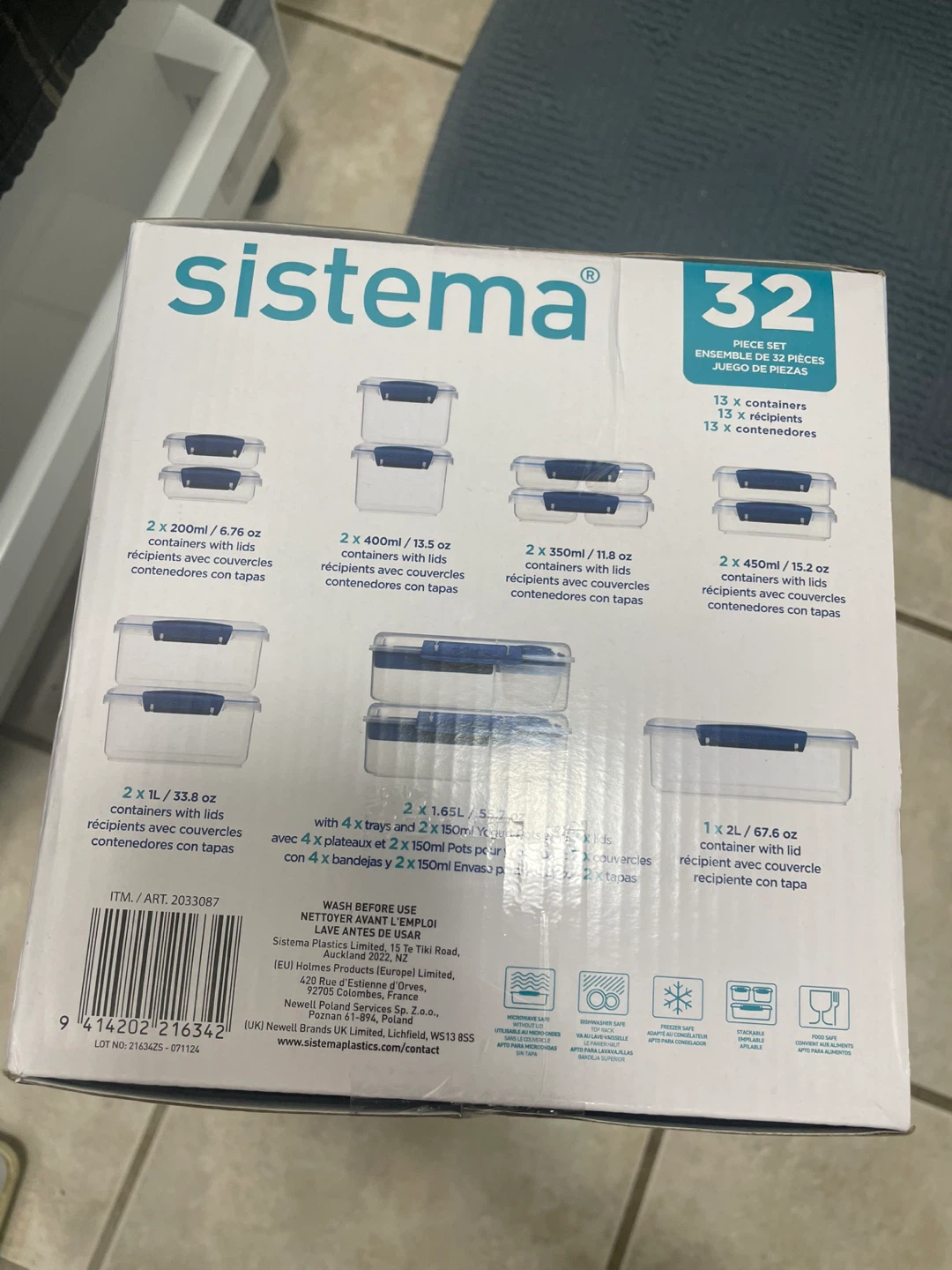 Selling a Sistema 32-piece food storage container set. It comes with multiple containers with lids. The set includes containers of various sizes, ranging from 200ml to 2L. The containers feature easy locking clips and flexible seals. BPA free